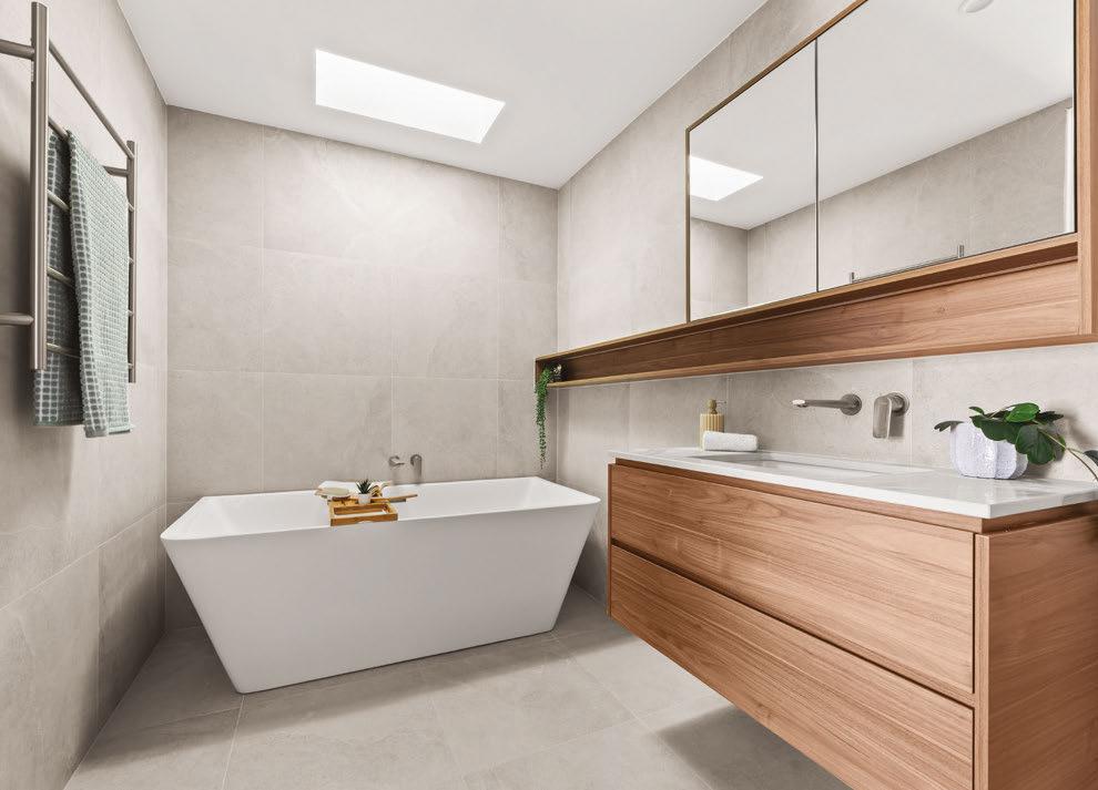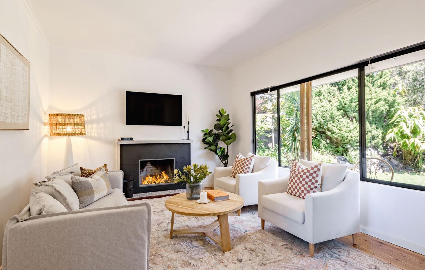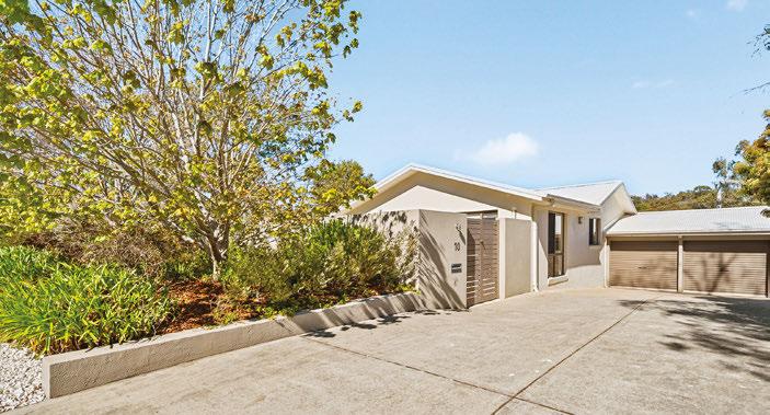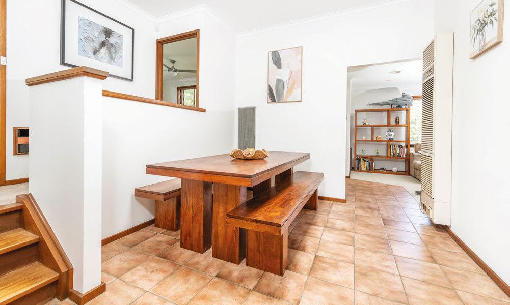 Just a short stroll from Merimbula’s cafes and waterways, this three-bedroom home comes with a fully self-contained studio. The open-plan living area fows to a leafy, heated balcony that feels like a second lounge, while downstairs ofers a home ofce and a second outdoor space. The large block also boasts ample yard space, with low-maintenance gardens.
