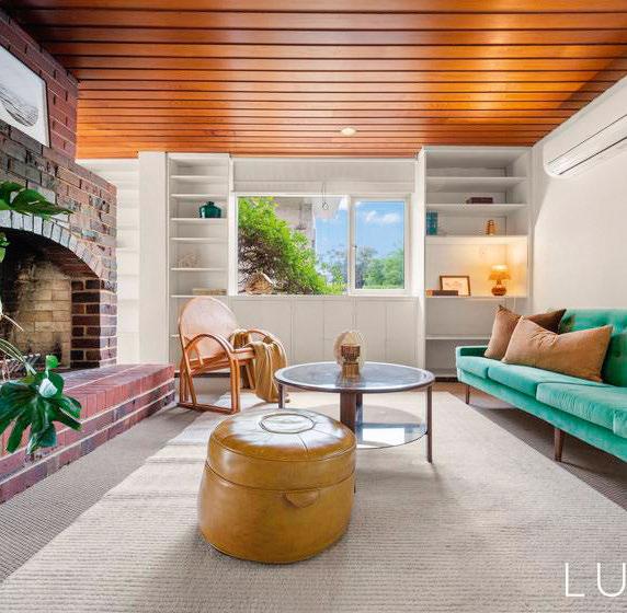 A modern twist on the mid-century modern style of Australian home builder Pettit & Sevitt, this stunning home features signature raked ceilings, exposed beams, and acres of glass looking onto a leafy internal courtyard. The brand-new kitchen, bathrooms and huge butler’s pantry-laundry bring modern conveniences with the clean lines and bold colour choices. The elevated timber verandah ofers sweeping views of the city and mountains.