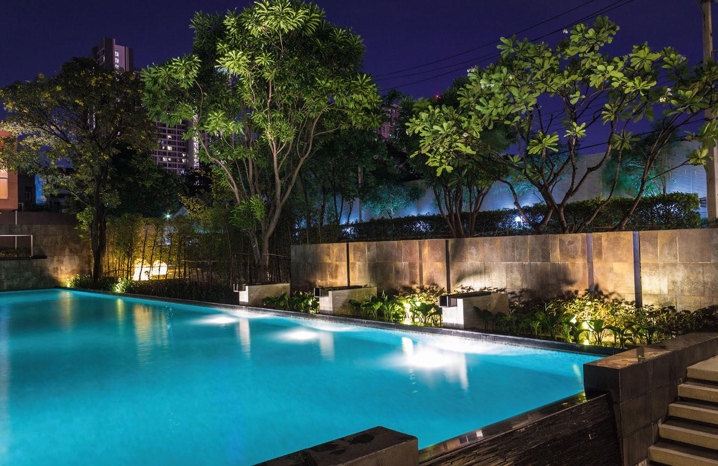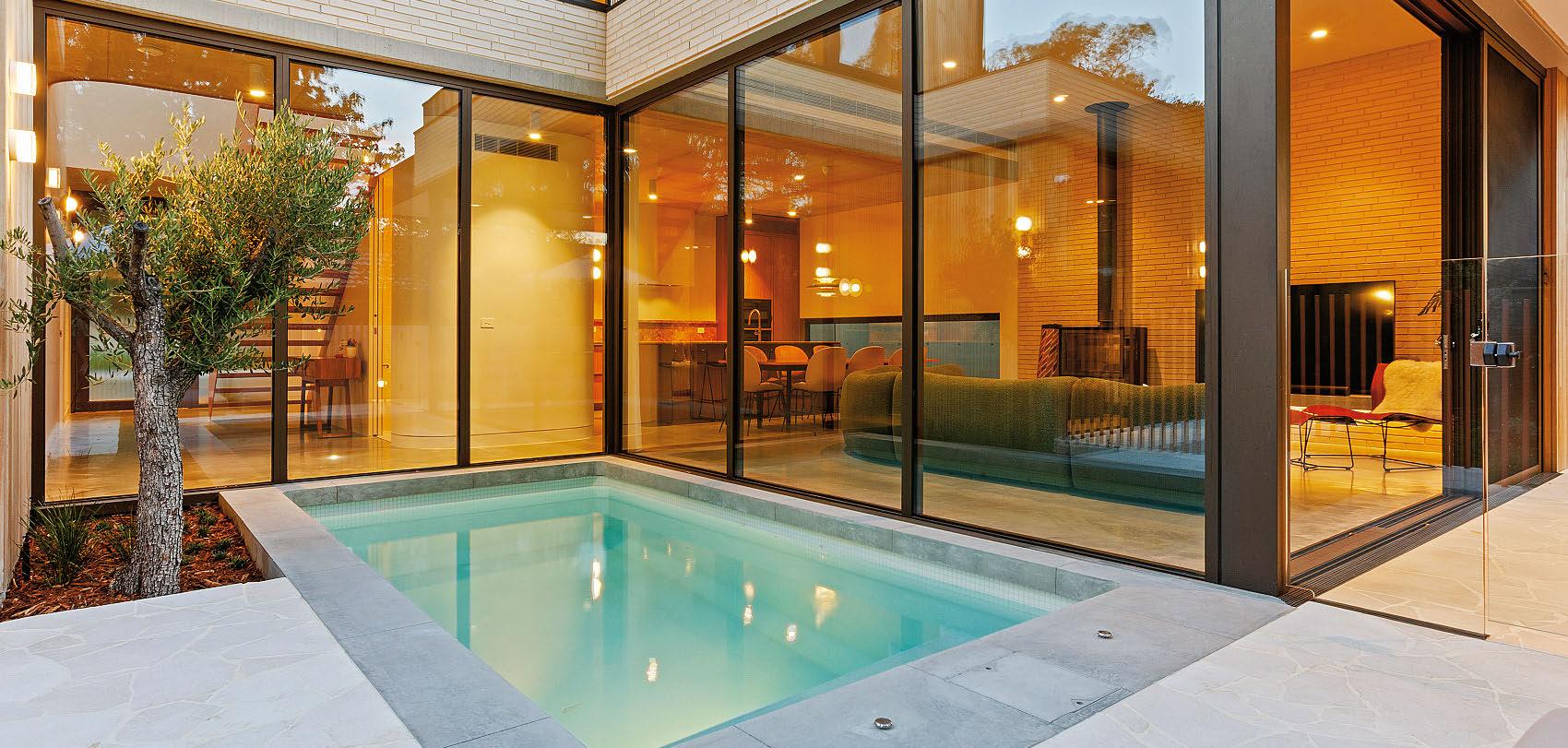 living area, with its sleek lap pool clad in Italian glass mosaic tiles.