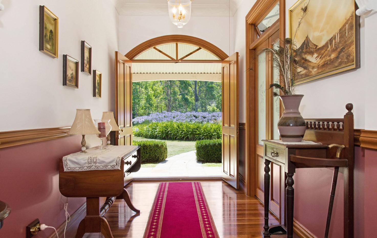 Up a circular driveway lined with old roses, you’ll fnd this elegant house on two hectares of cleared land. The home showcases spotted gum foors, decorative ceilings, a double-sided freplace and custom-made cedar doors and windows. French doors open to tiled patios from every bedroom. A four-car garage has its own loft and bathroom.
