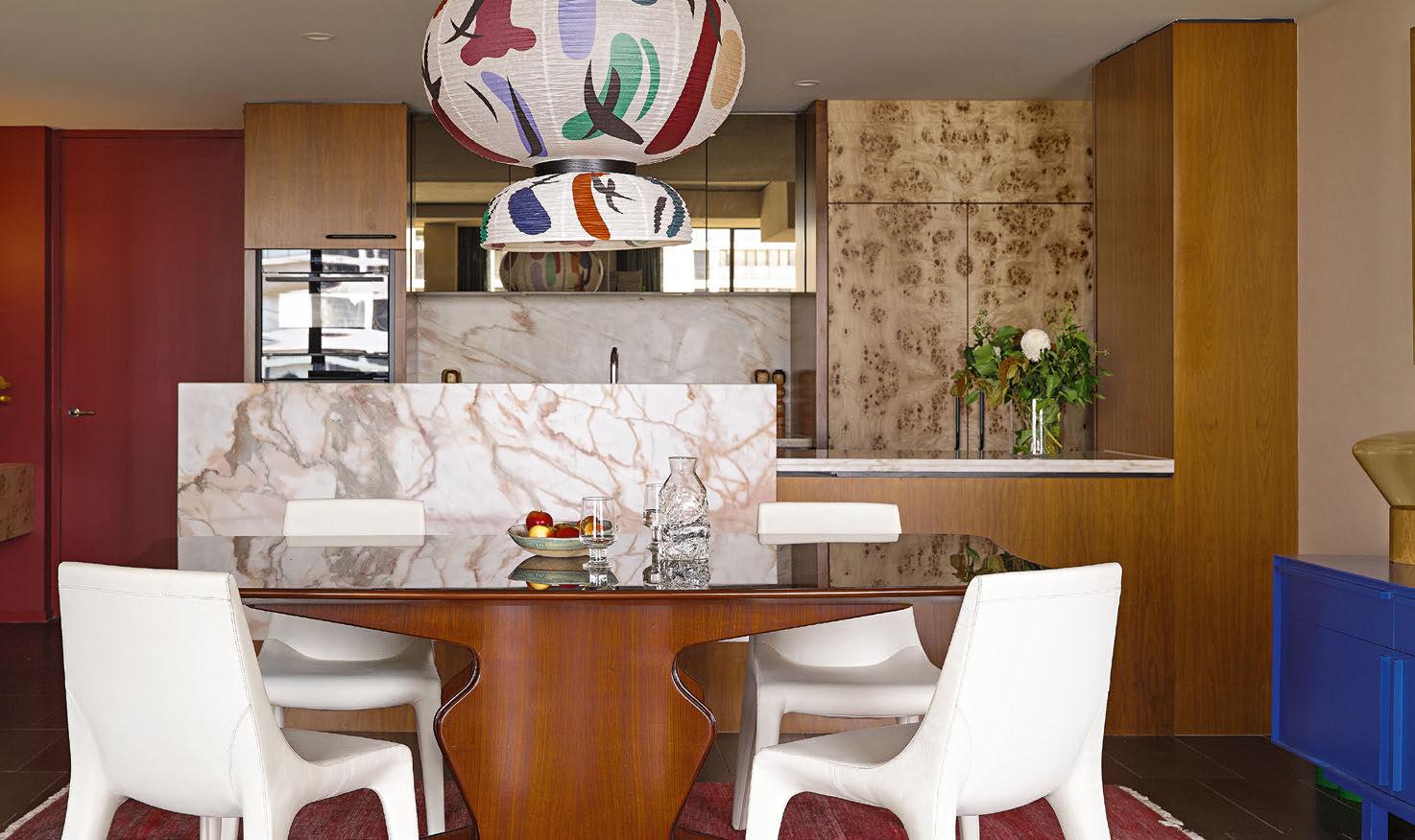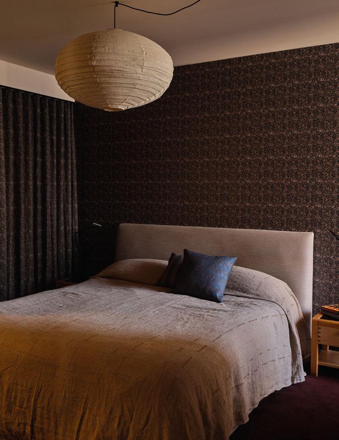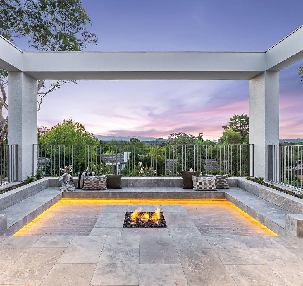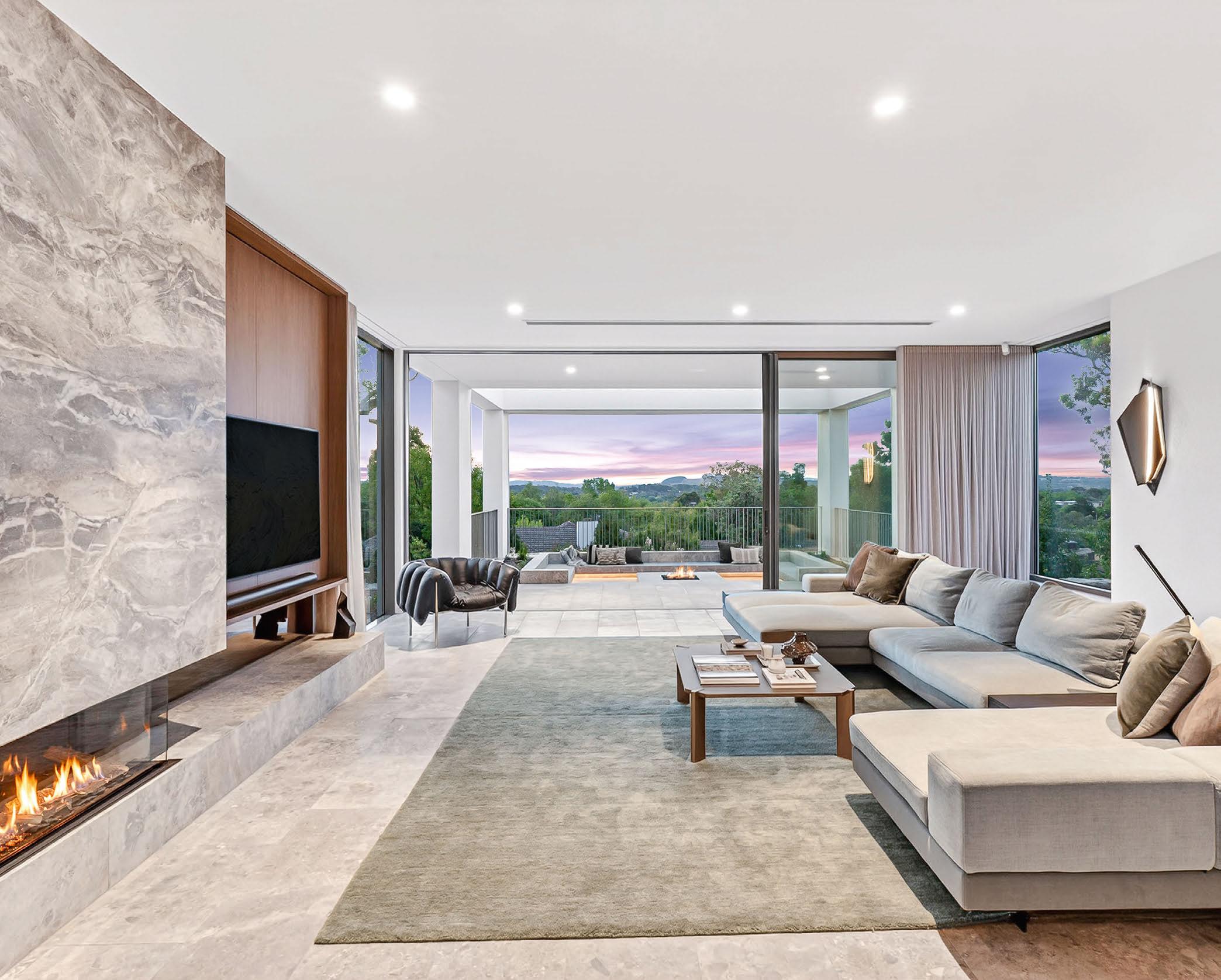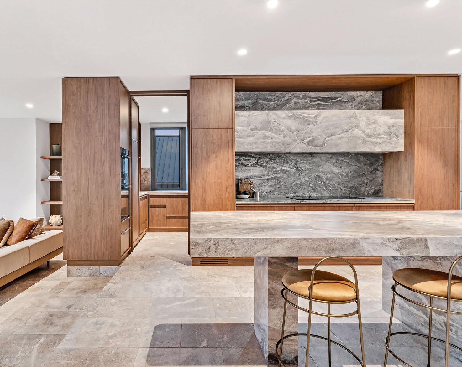 Spanning over 600 square metres under roof and connected by a commercial-grade lift, the interiors are defned by an organic palette of materials – championed by cascata grey marble fnishes and Florentine walnut joinery. The main living level showcases a central living, dining, and kitchen hub, as well as a guest and formal living wing. The open-plan core is highlighted by a three-sided marble Ortal freplace. The kitchen is a bespoke marvel, featuring walnut joinery and honed marble surfaces, along with a roll call
