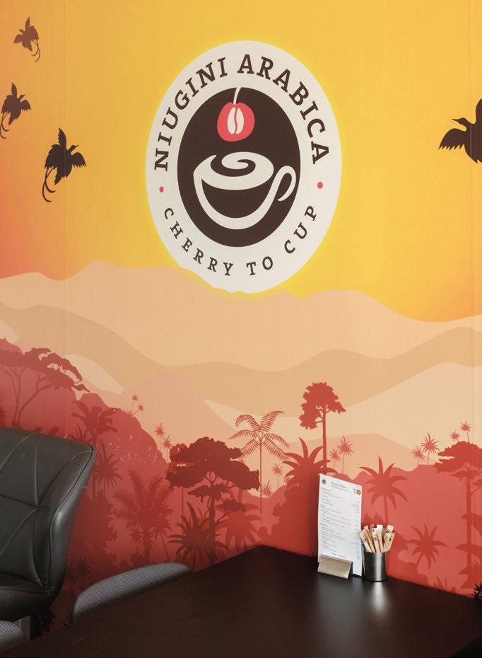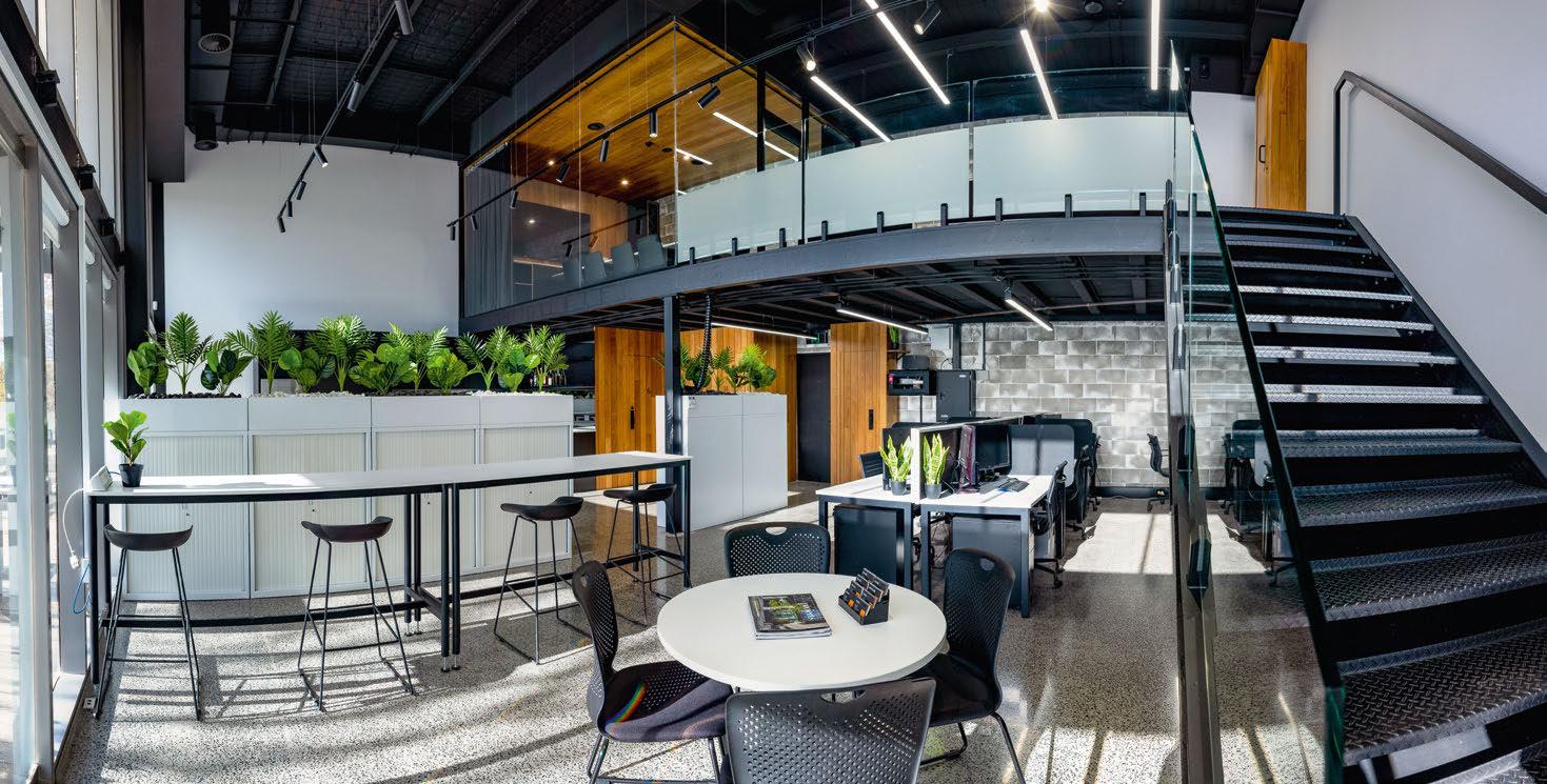 Features include 96 square metres of ground-foor area and 42 square metres of mezzanine. It has polished concrete fooring, exposed industrialstyle ceilings, and full-length glazing, and ofers an open-plan layout with a boardroom, kitchen and amenities.