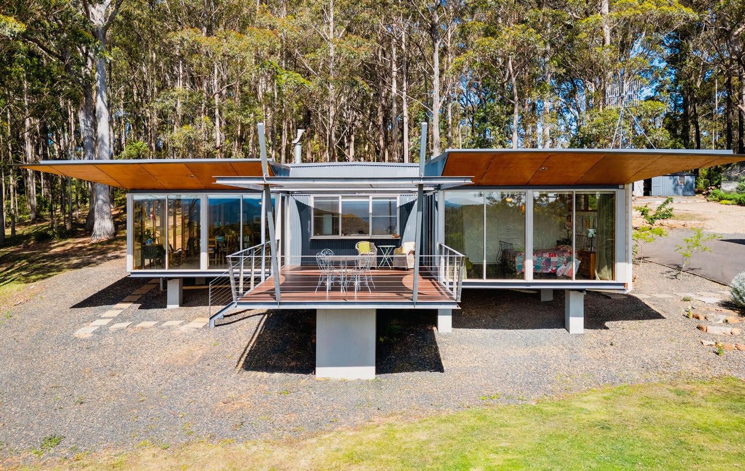 If you’ve dreamed of a life among the treetops, this architectural retreat near Braidwood delivers it beautifully. The design makes a bold statement while sitting quietly within nearly 10 hectares of native bushland. The two-bedroom main home features foor-to-ceiling glazing and a limestone bathroom. A separate studio adds fexibility.