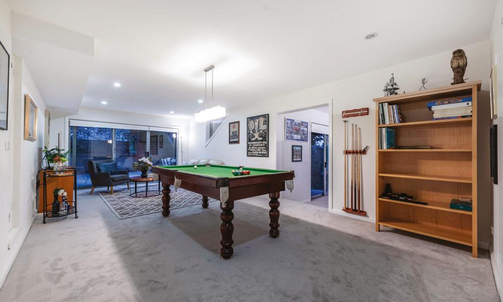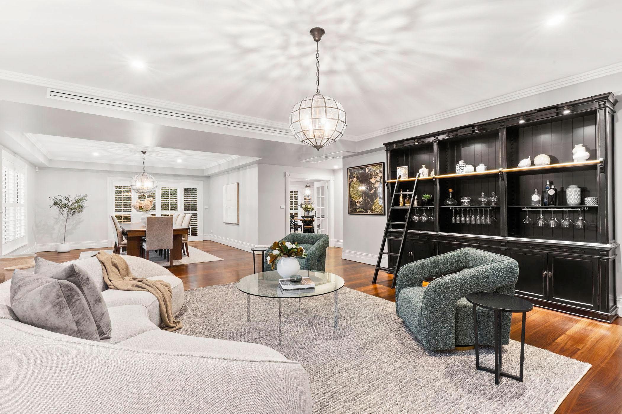 The upper level houses the primary bedroom suite, featuring a dressing room with a make-up station, and a luxurious en suite highlighted by a custom soaker tub. There are a further three bedrooms, all with en suites featuring Villeroy & Boch fttings and Brodware tapware. The lower level is a dedicated wellness and entertainment precinct featuring