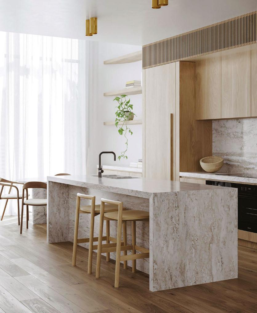 The stunning open-plan kitchendining area is light-filled thanks to Velux skylights, with a Caesarstone breakfast island, two Siemens pyrolytic ovens, and a 1200-millimetre Qasair commercial rangehood over the gas cooktop. Adding to the wow factor is one of the bathrooms where Astra Walker copper tapware pairs with a free-standing copper bath and Forcrete microcement bathroom walls.