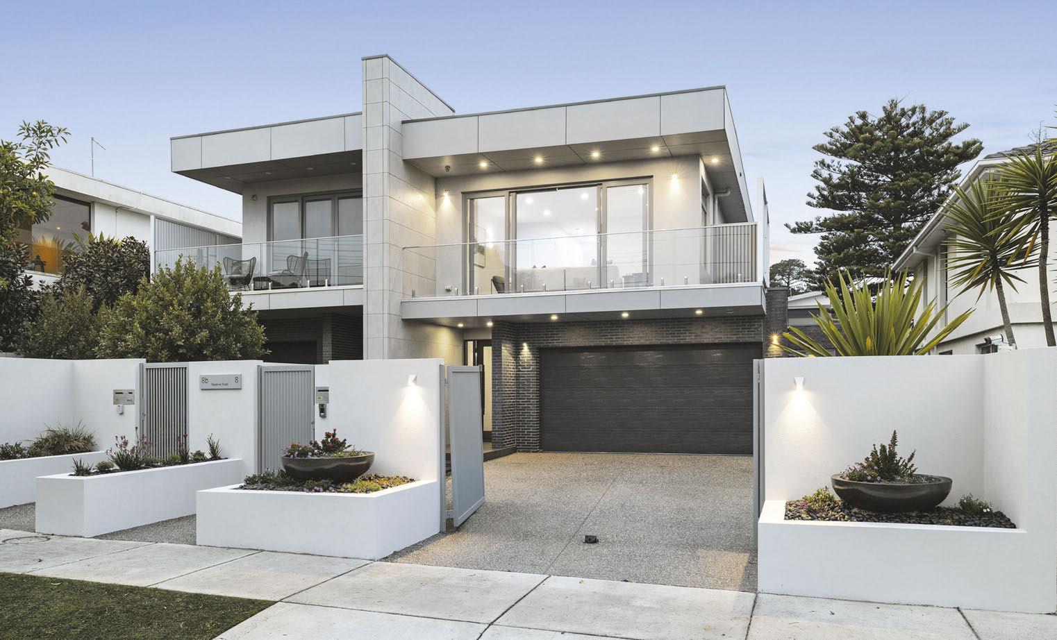 Designed by PCG Design Architects, this house, with its dramatic geometric facade, offers contemporary luxury. It includes split-level formal and informal zones, a designer kitchen with V-Zug appliances, and a heated pool and spa. Features include sandstone tiles, timber panelling, marble, custom cabinetry and an environmentally friendly fireplace. In the heart of the Bayside school zone, it is a quick walk from the beach, two stations and Church Street shops.