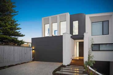 up against the lap pool. Upstairs, you’ll find two bathrooms, two minor bedrooms with built-in wardrobes and desks, and the main with a walk-in wardrobe. Moody hues, timber accents and polished concrete floors embody the contemporary vibe. Stroll to the beach and Ormond Village. ●