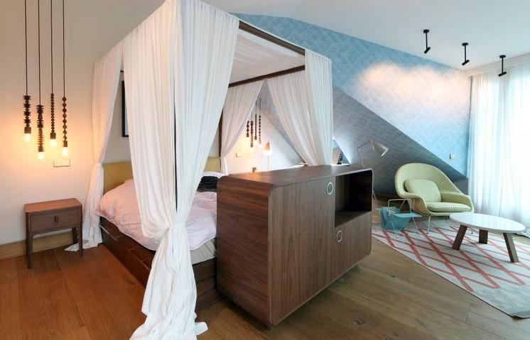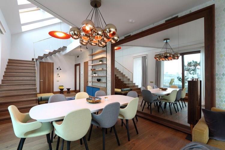 This is two story apartment on the top floor of the historical center ofRiga. It has a fantasticviewon Riga’sstreets,Jugendstil housesandtheirroofsso it was important to make the view as a part of the interior.