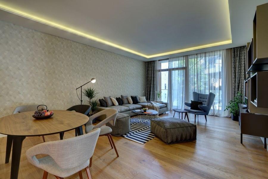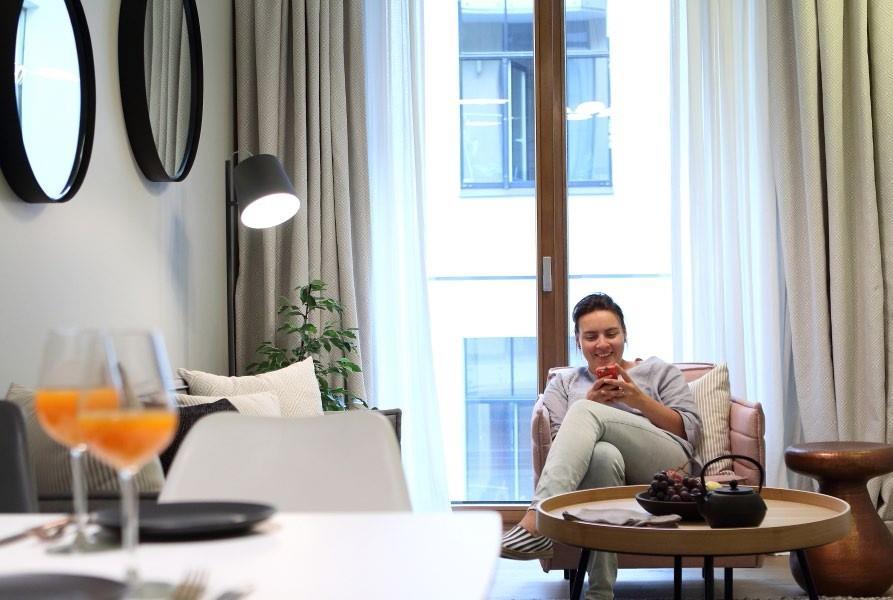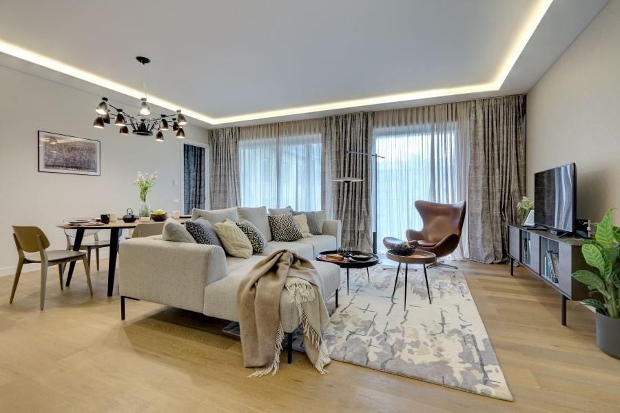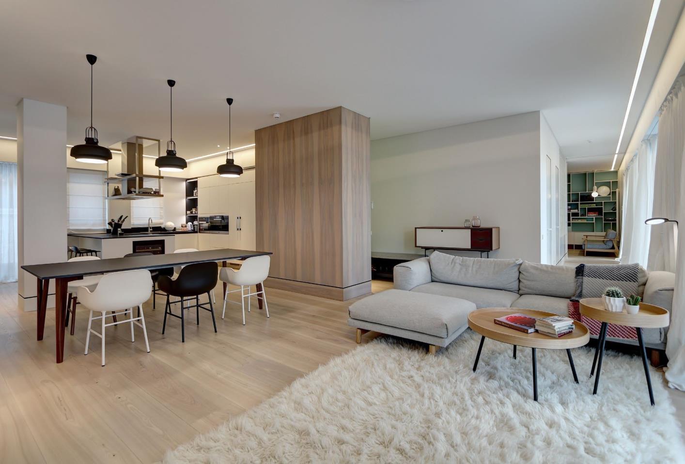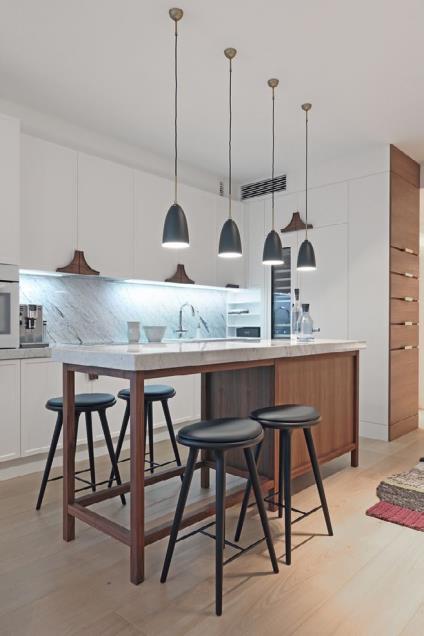 Light, spacious two storied apartment with a sense ofgentlewarmthandcosyness.Sereneliving space, perfected with an utmost care, where the color, tex tureandmaterialsplayin fulldiversity.Materialsof exquisitequality, elegant,functional design objects, textileandlighting fixtures fill theinterior, refining the ambience of the space up to the slightest detail.