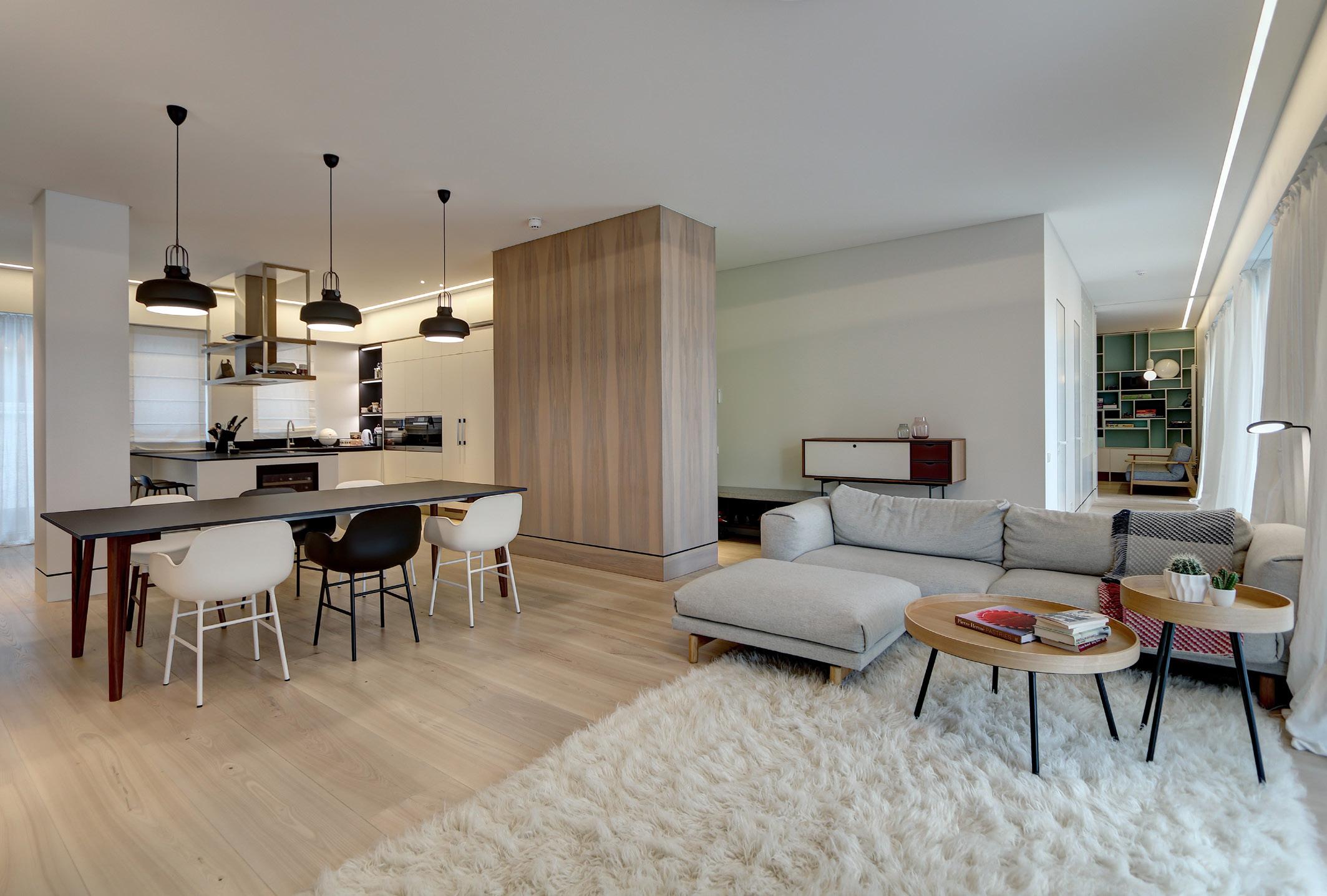 Light, spacious two storied apartment with a sense of gentle warmth and cosyness. Serene living space, perfected with an utmost care, where the color, texture and materials play in full diversity. Materials of exquisite quality, elegant, functional design objects, textile and lighting fixtures fill the interior, refining the ambience of the space up to the slightest detail.
