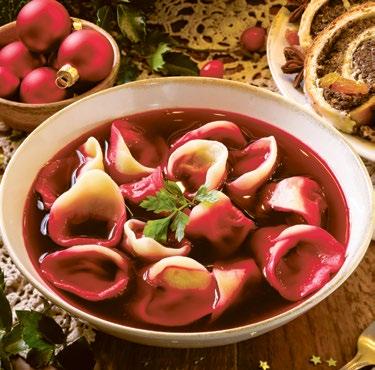 Zur Vorspeise wird in Polen an Heiligabend traditionell Barszcz serviert. Die Randensuppe wird mit Uszka – mit Pilzen gefüllten Teigtaschen – getoppt. Neben dem Genuss steht das Gericht auch für den Beginn einer feierlichen und besinnlichen Zeit im Kreise der Familie.