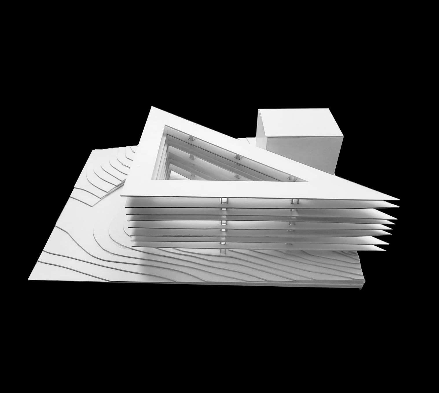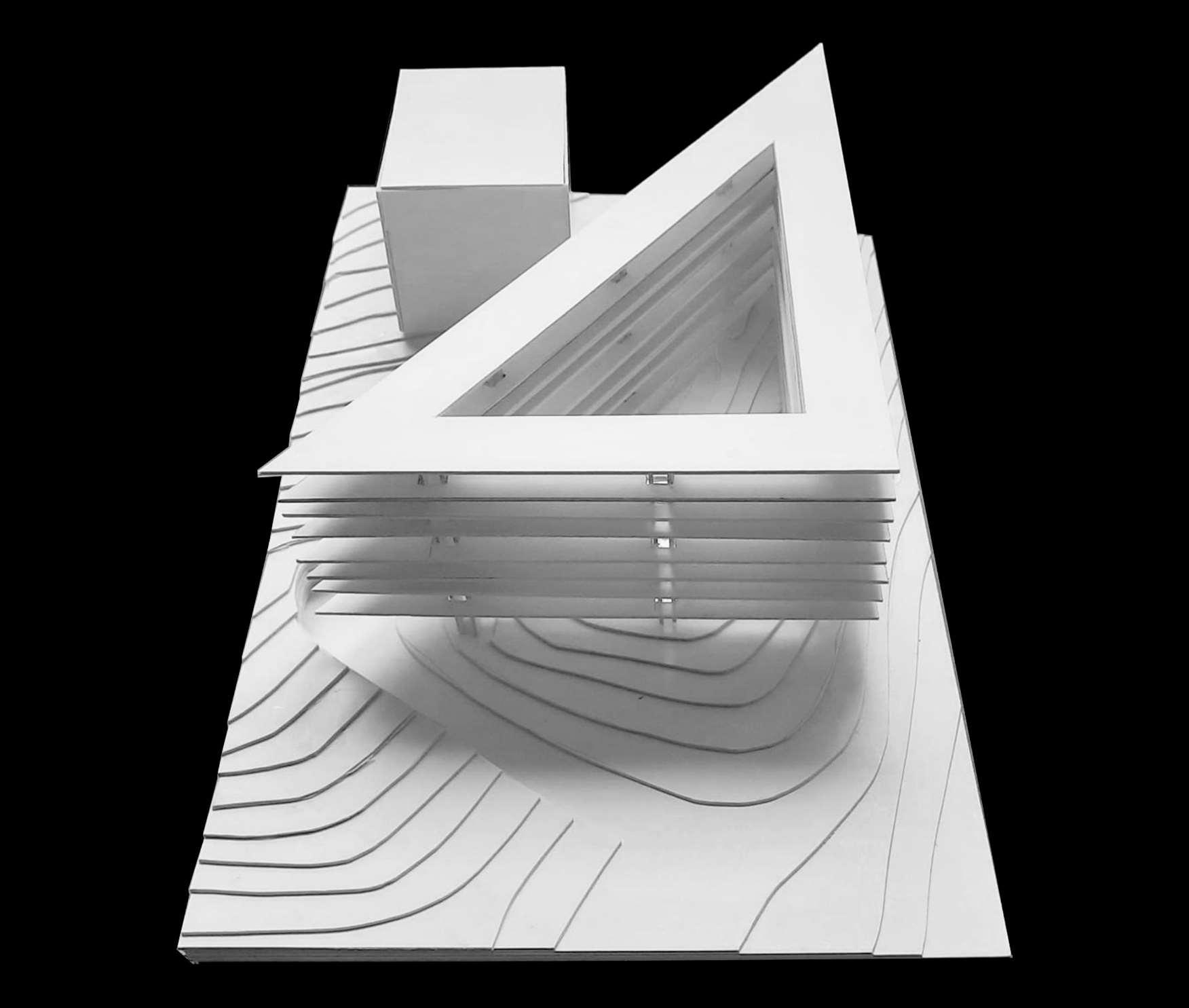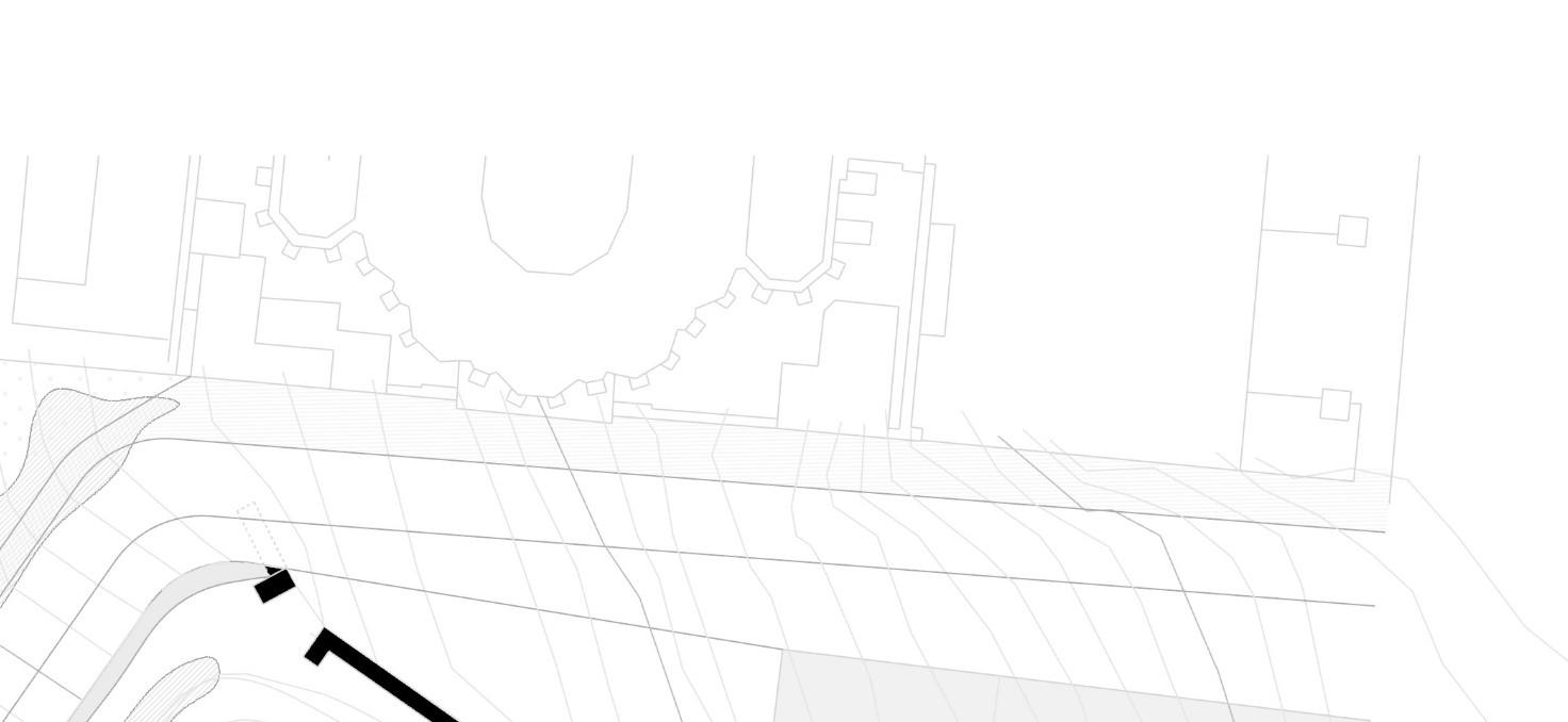 Eledificioseposasobreelterrenodemaneralevedebidoasucondiciónobjetualyala voluntadderecuperarunapendienteexistente.Provocandounatensiónobjeto-terreno sugerente,quiméricayabstracta.