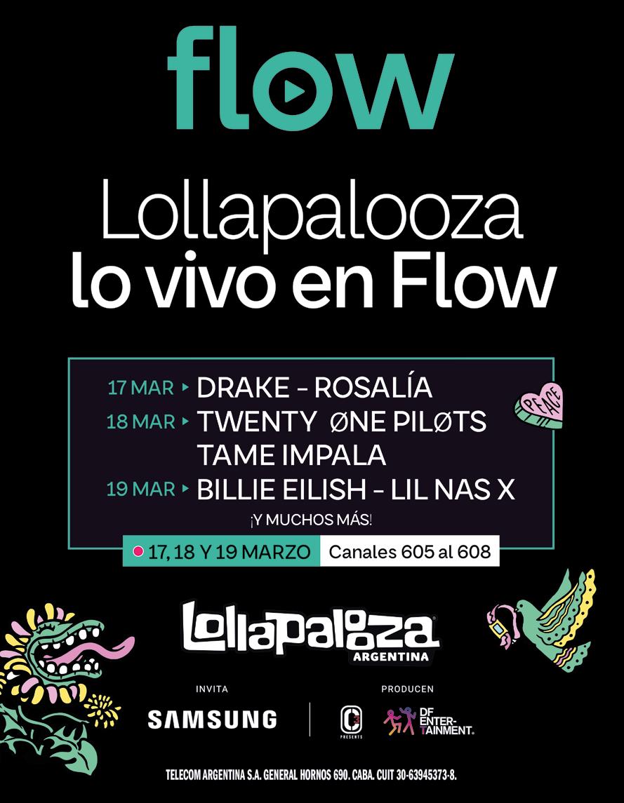 El mes de marzo tiene con el Lollapalooza el evento del año para el showbusiness argentino de la mano de DF Entertainment. El fin de semana del 17, 18 y 19 de marzo se reunen cientos de miles de personas en el Hípodromo de San Isidro, a la vez que todo el país podrá seguir el festival a través de Flow como el OTT líder del mercado. En 2022 más de un millón de especatores pudieron ver el festival a través del streaming de la plataforma. Encabezan el line up de esta edición de Lollapalooza Argentina Drake, Twenty One Pilots, Billie Eilish, Rosalía, Tame Impala y LilNas X.