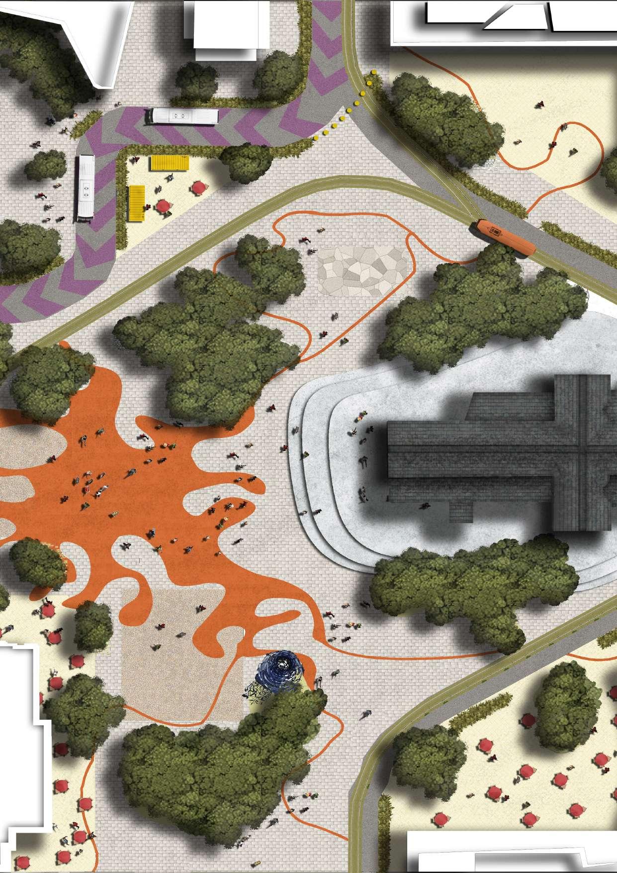 Looking from south to north, the site’s dynamics and pedestrian circulation are clear. The impressionistic, overhead chiton-like structure contracts as users exit the train station and enter the CBD, creating a sense of arrival.