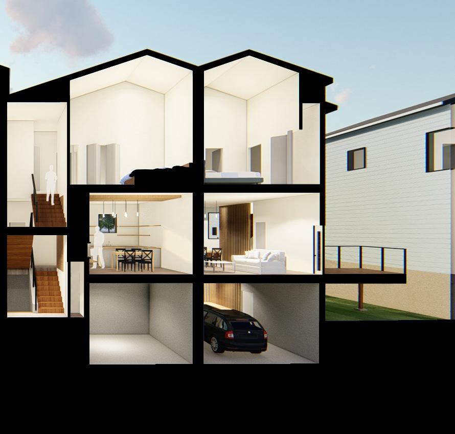 Professors Steve Hardy and Nate Bicak Partners Geneva Sinkula, Patrick Pineda, Sarah Janda, Maggie Coolidge-Van Duran, Ariana OstenThe NUhouse project was a collaboration project between three architecture students and three interior design students. Our team’s site was located in the northeastern corner of Valentine, NE in a newly plotted addition to the town. Our design consisted of 5 empty lots that shared similar conditions including, flat topography, little to no tree cover, and being located on corner conditions. Our team’s design was intended to give the citizens of Valentine more affordable options for housing, as well as increase the density of housing to make the project more appealing to developers. The design focused around creating strong ties to the community through community spaces and set a standard for future developments.