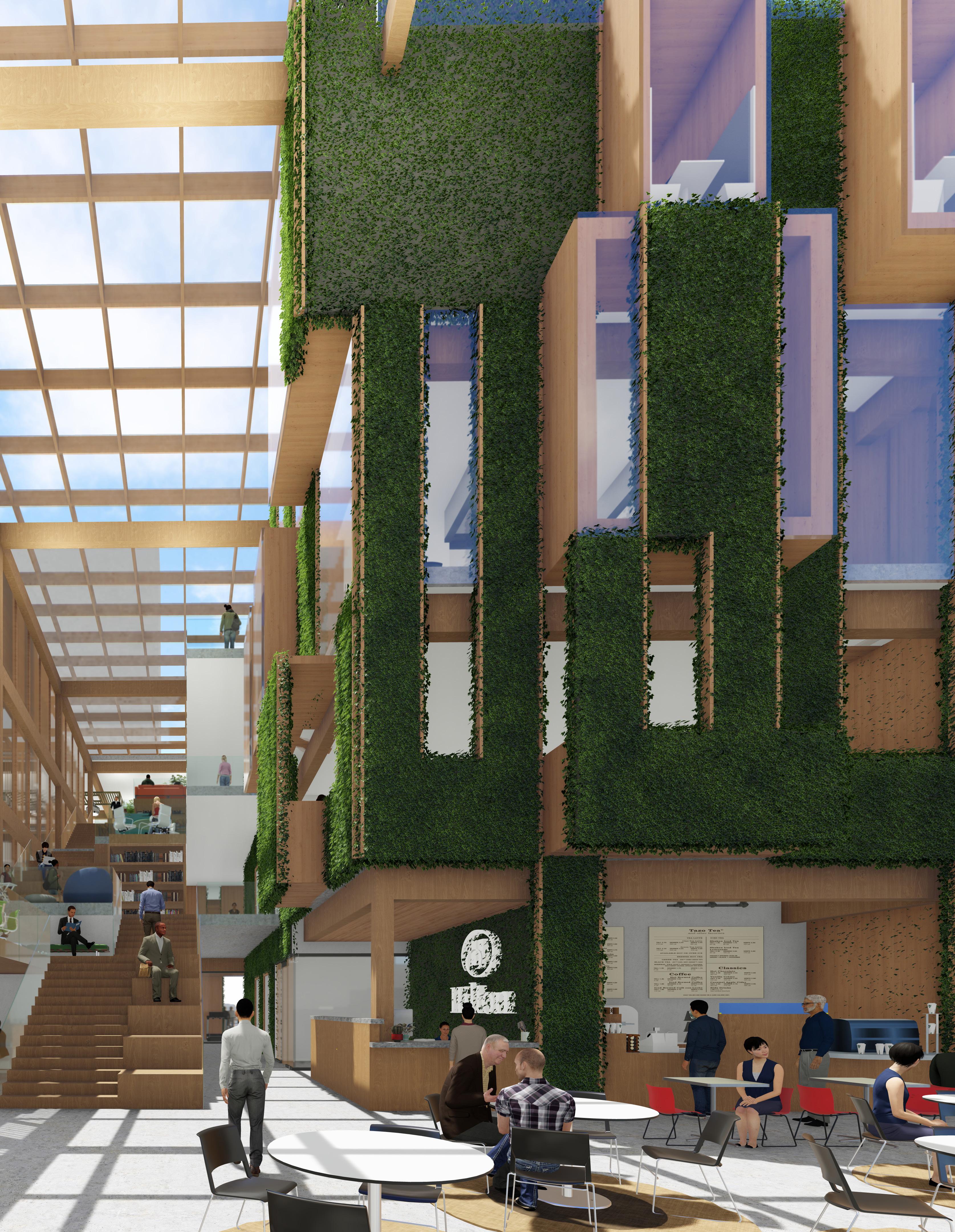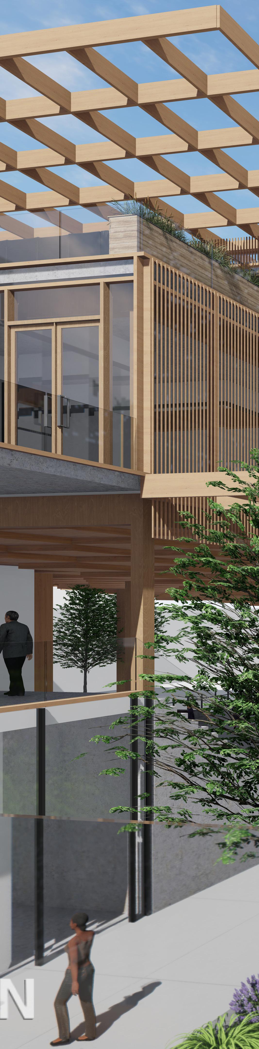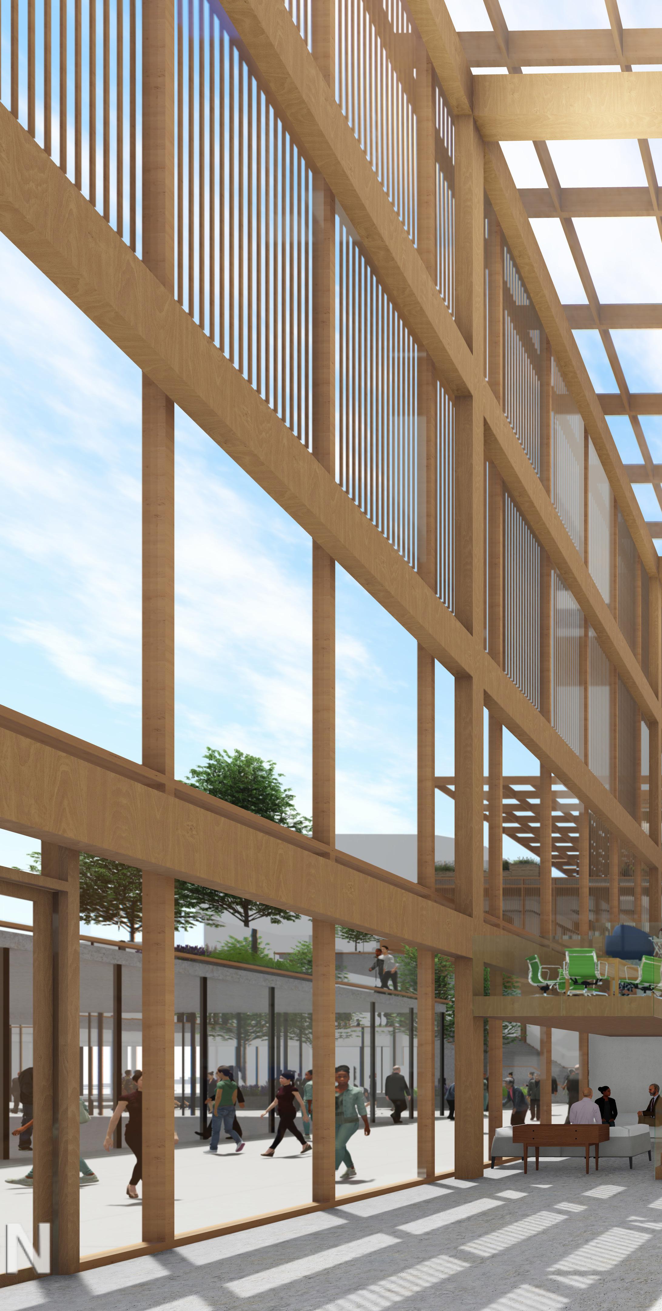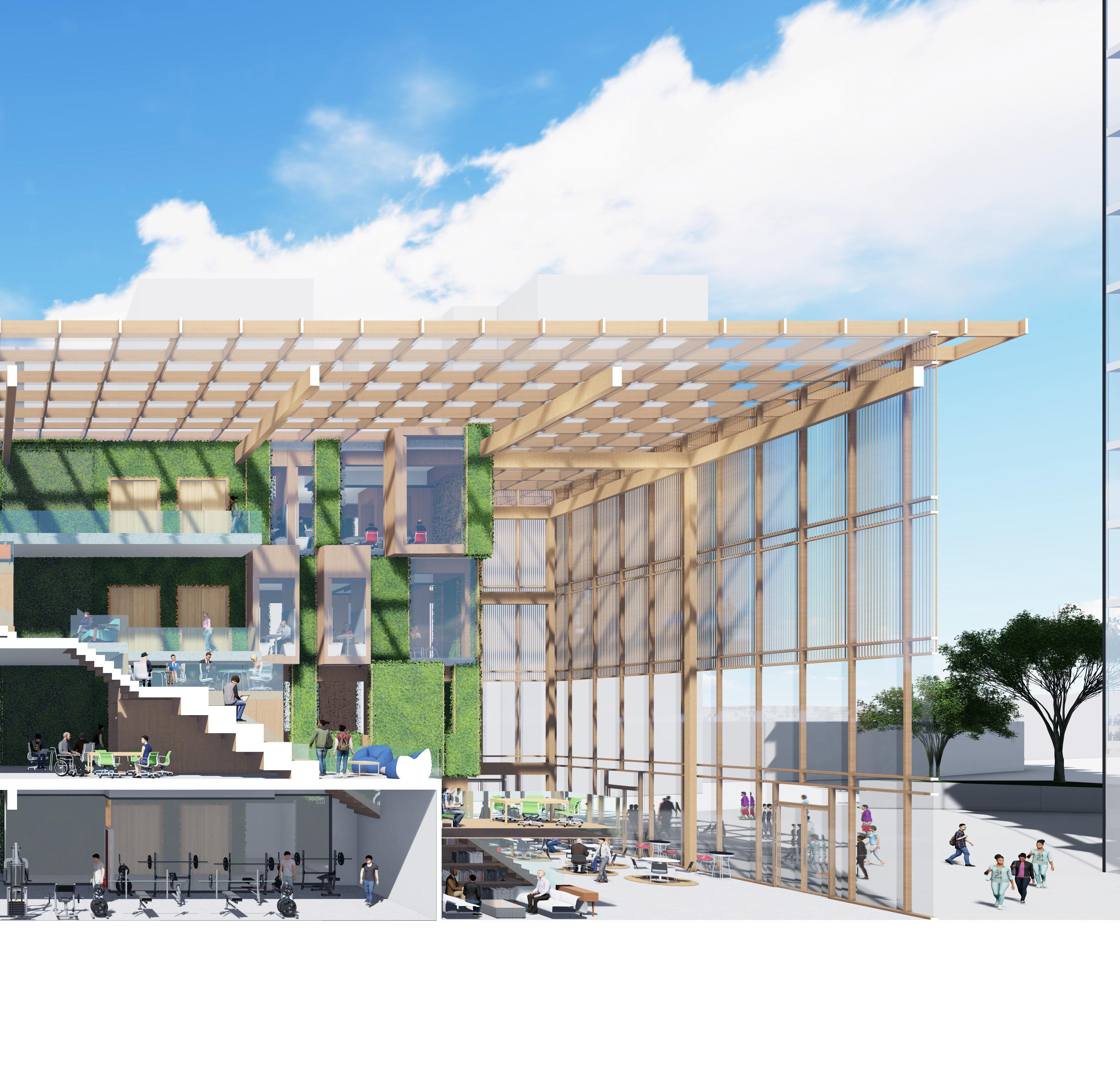 While the site is for both employees and the public, the office building will act primarily as a collaborative space that restores employees desire to work in person. Sustainable design, materiality, and flexible workspaces maximize positive experiences for employees. Through implementation of green facades, a secondary solar shading structure, optimal building orientation, and improved thermal massing materials our design creates a comfortable environment in a sustainable building. The design focuses around the grand stairs that create diverse spaces that allow the employees to connect and flow between each floor’s program. The stairs end at the social program that explore the office as more than just a place for work.