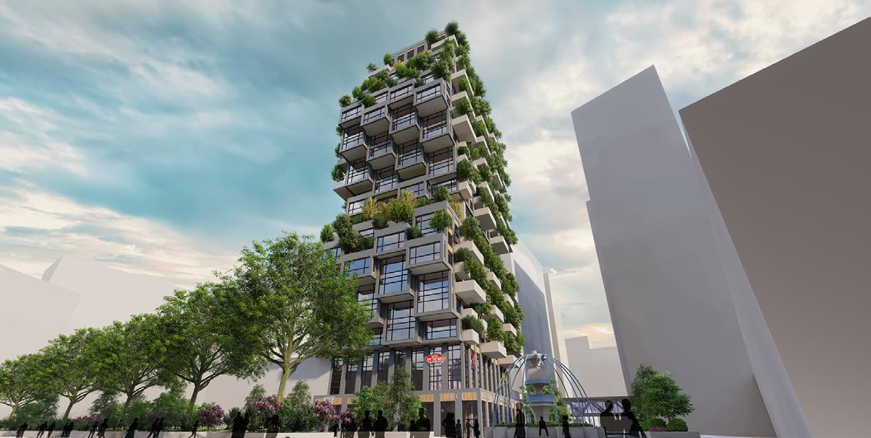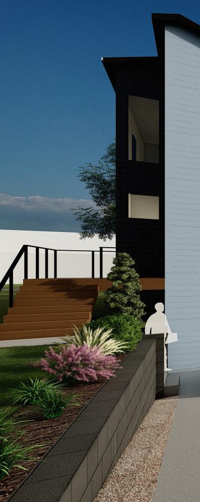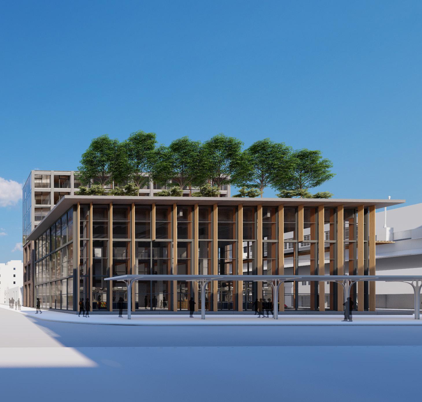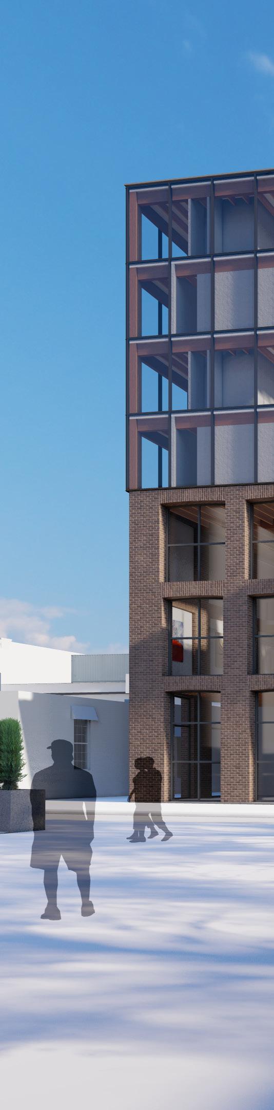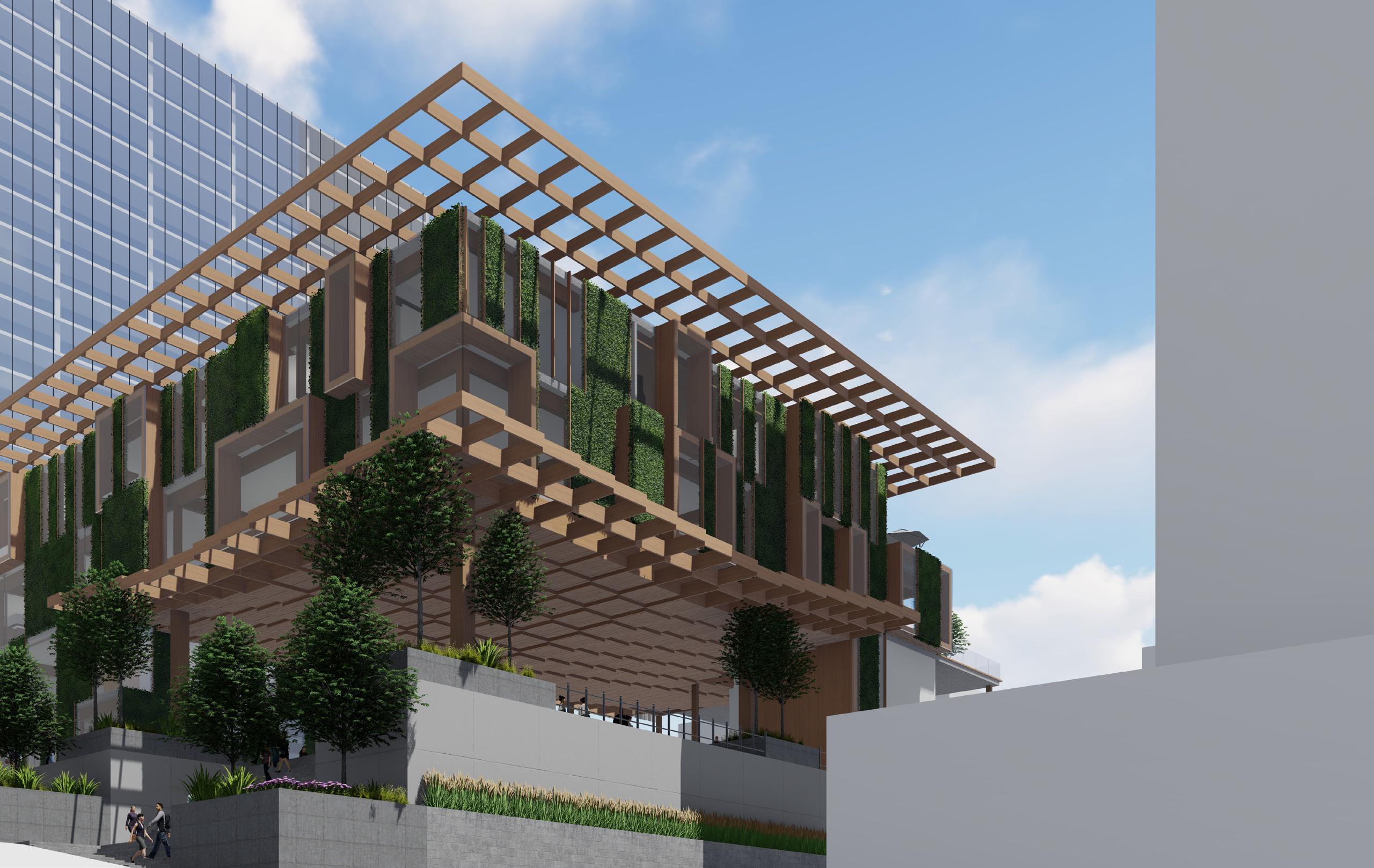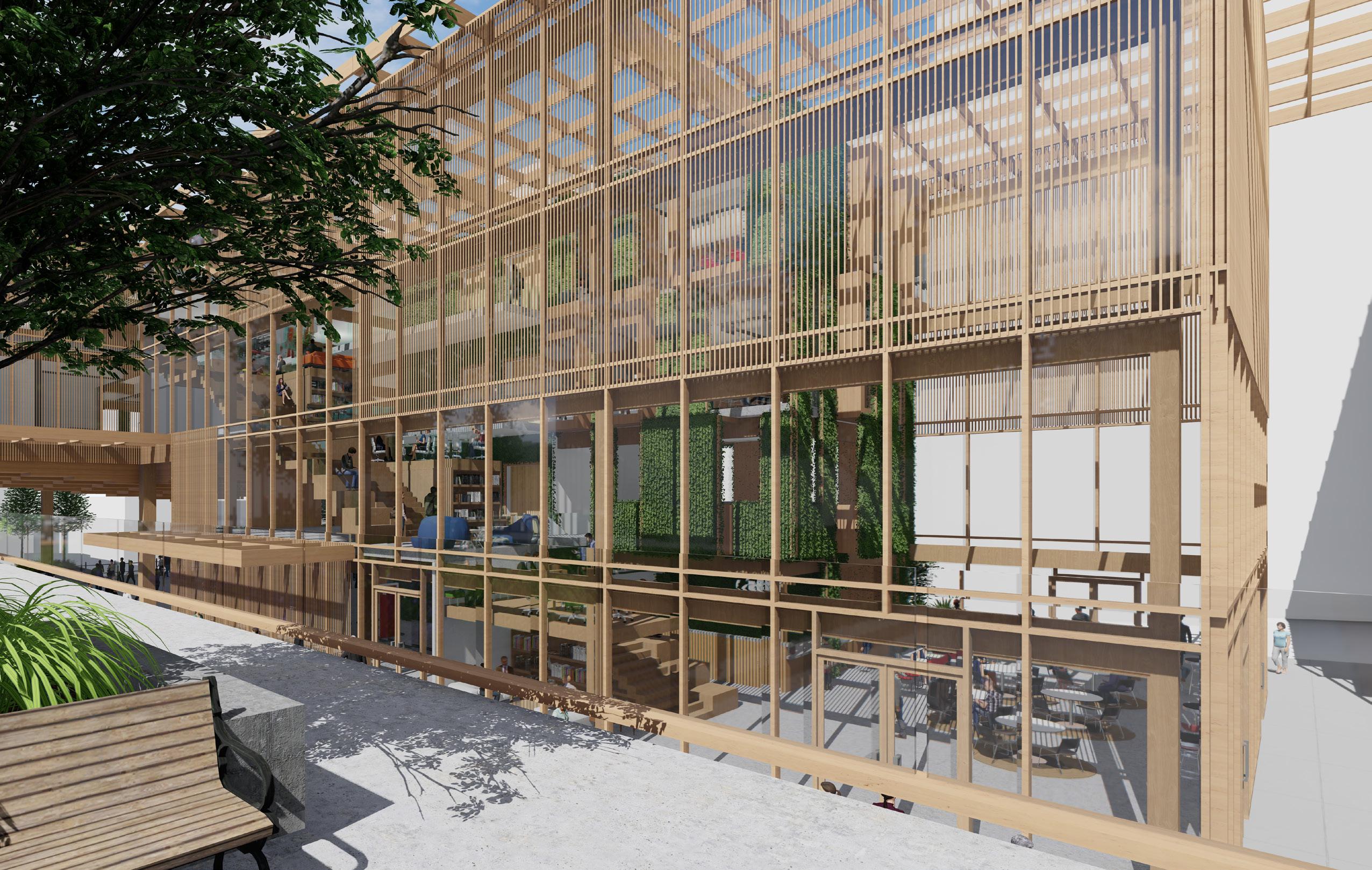 Exterior view of the southern facade and landscaping showing the materiality, focal presence, and green aspects of the design Polaris Place
