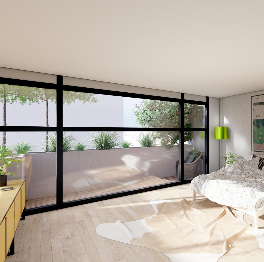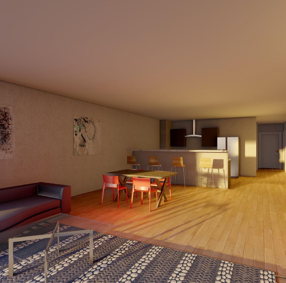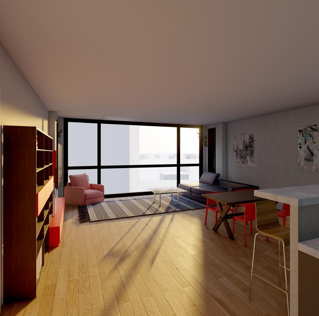 The plaza space associated with the design attempt to encourage certain circulation through the site by being open in the north south corridor and having larger right of ways along the buildings. The space also creates more intimate areas where planters and vegetation define non-right of way space. The interior spaces in the units blur the lines between interior and exterior with large balconies and almost full wall windows, while the penthouse spaces emphasize the sky and height of the space.