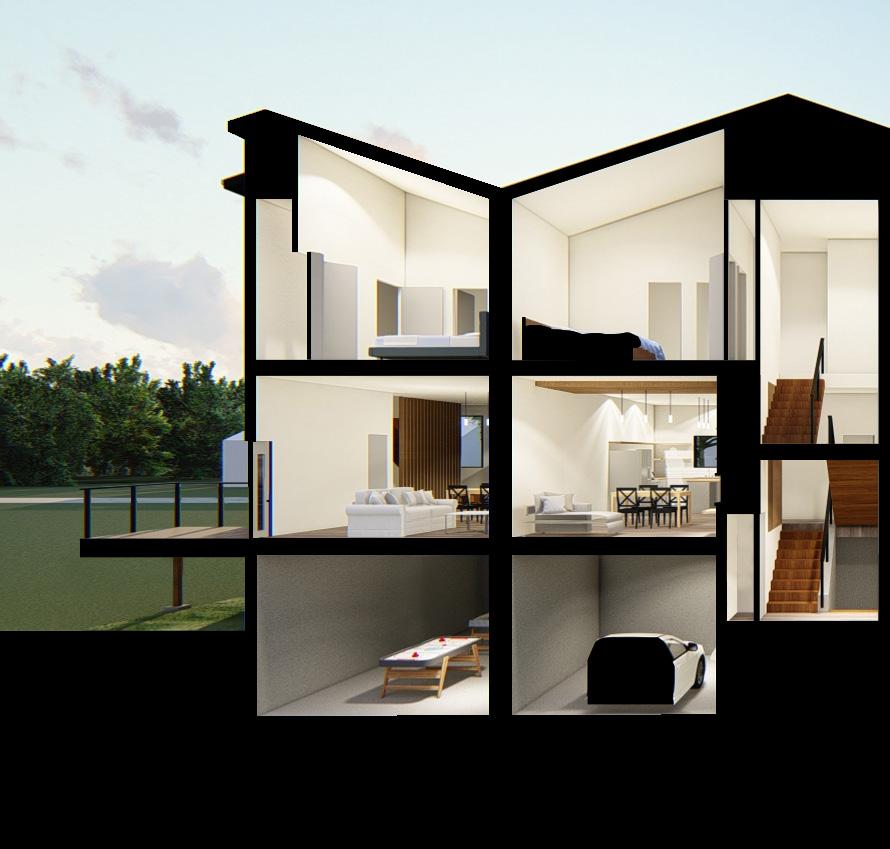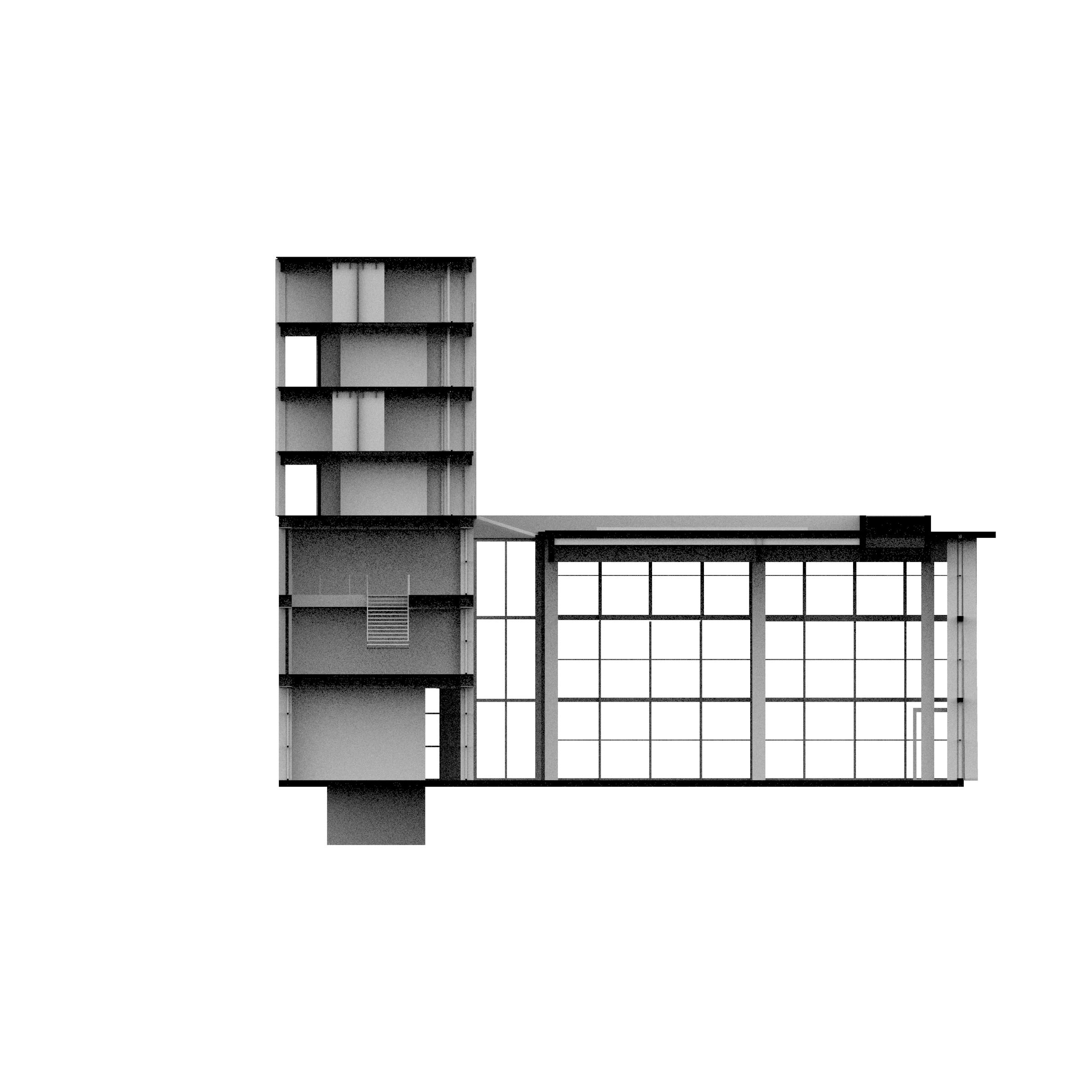 Section perspective render highlighting the vertical circulation and the segregation of program based on its privacy