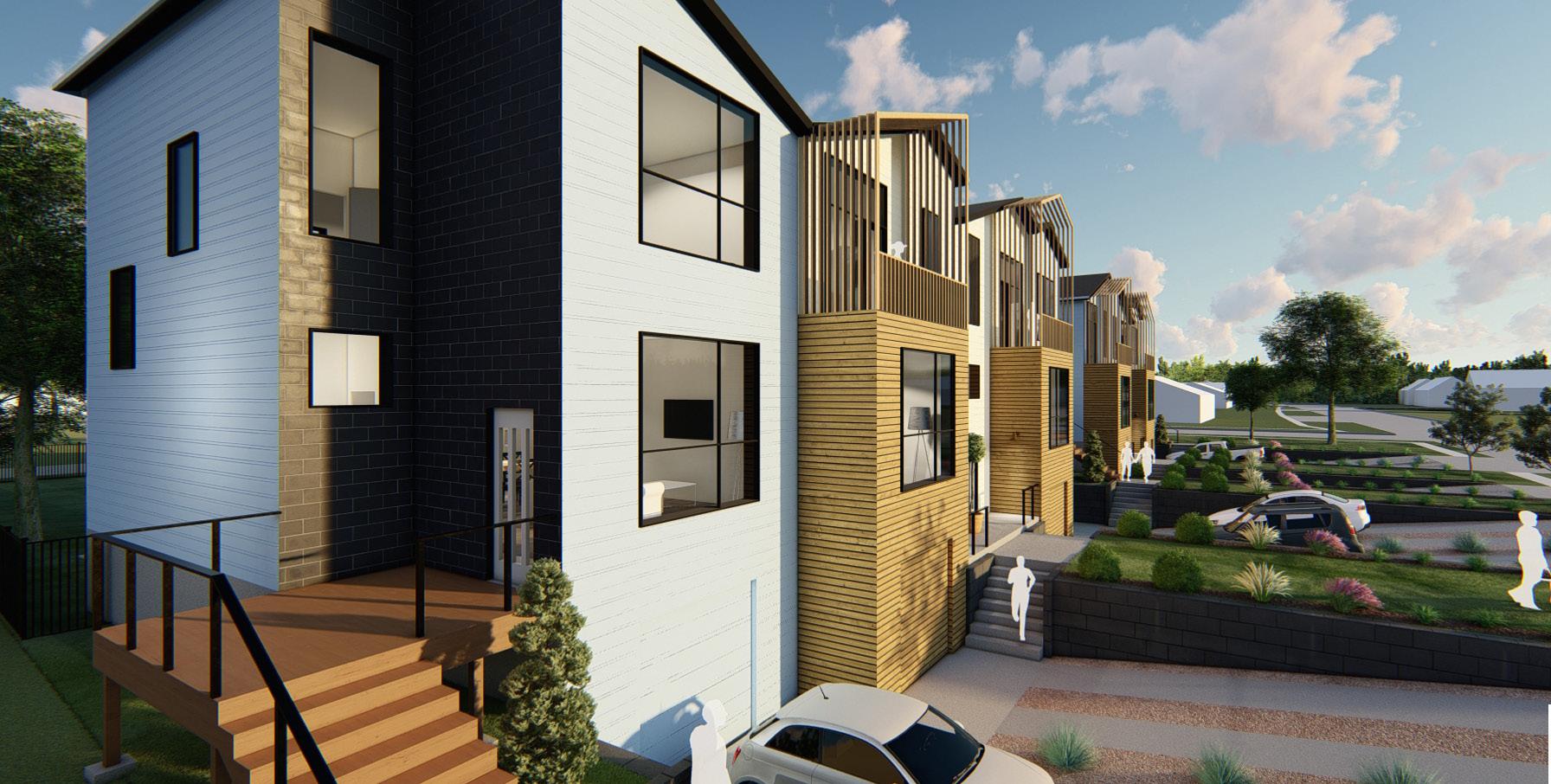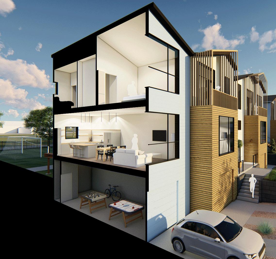 Due to the spread out nature of our site and its context as a new neighborhood in Valentine we were able to use our design to have a heavier impact on the surrounding context. This would break up the existing nature of efficiently built single family homes and multifamily duplexes thus giving the neighborhood more diversity. We intend our three level townhouses to be sensitive to the local built context and community, but also change the context from your typical box duplex to a more thoughtful design. While designing this project we had to constantly remind ourselves of our goal to provide affordable housing for Valentine which informed the typology of our design to be row style townhouses that are efficient to build, with cost effective materials, and using the city code to maximize the impact our design would have on the town.