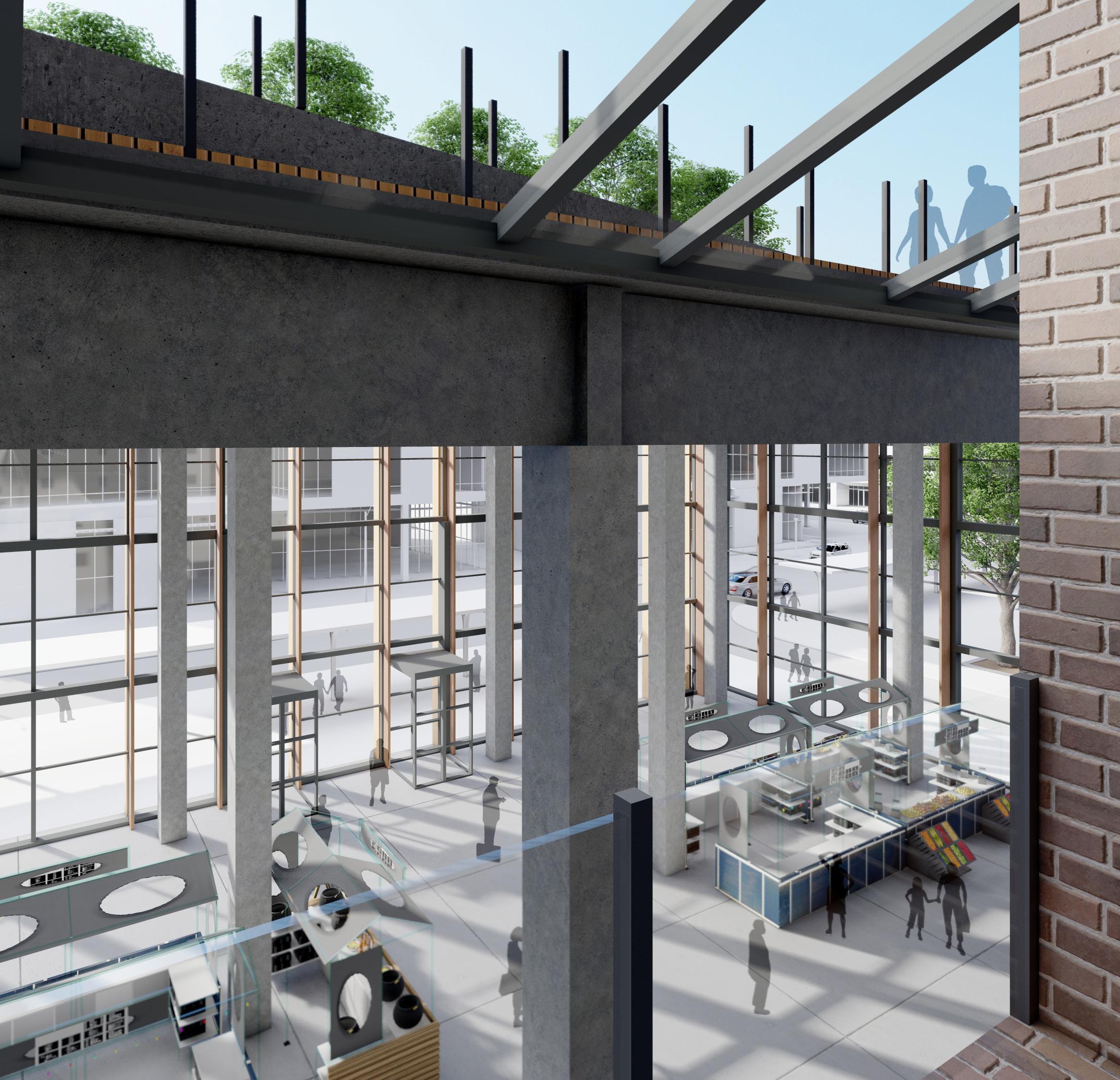 Professor Craig Babe Partner Will DostalThe historic facades of the Haymarket bordered our site on the North and West Sides and presented opportunities to tie our design back to the context. Our design highlights the alignment of our building with the Ollson building to the West with our market hall and aligned our tower with the historic building to the East. Our courtyard was situated on the North side of the site, allowing for us to keep the current flow through the haymarket.