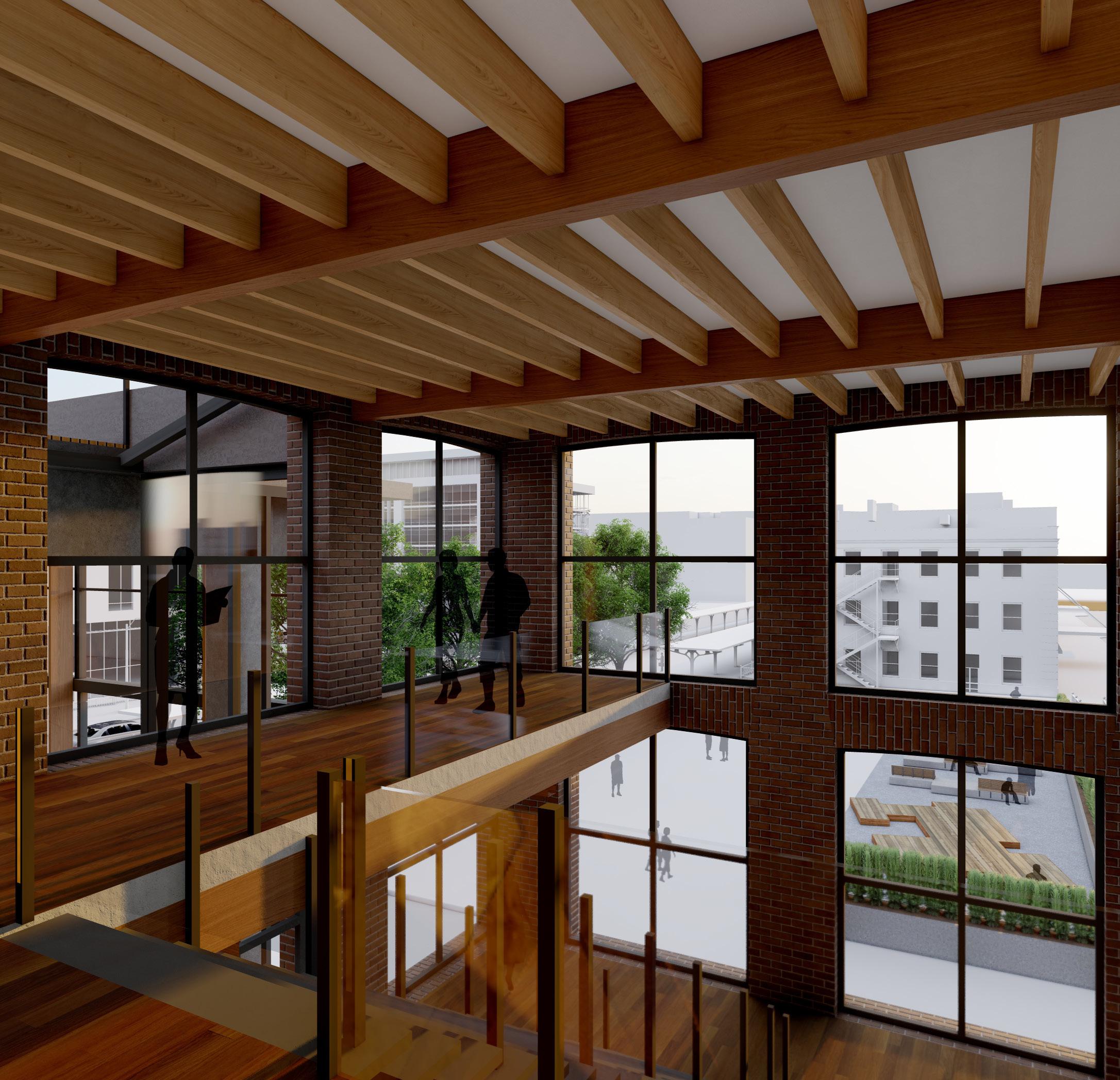 The atrium acts as a mixing pot of program, workspaces, and public entries. Its transparent nature serves to open the design up into the community and blur lenses between indoor and outdoor.