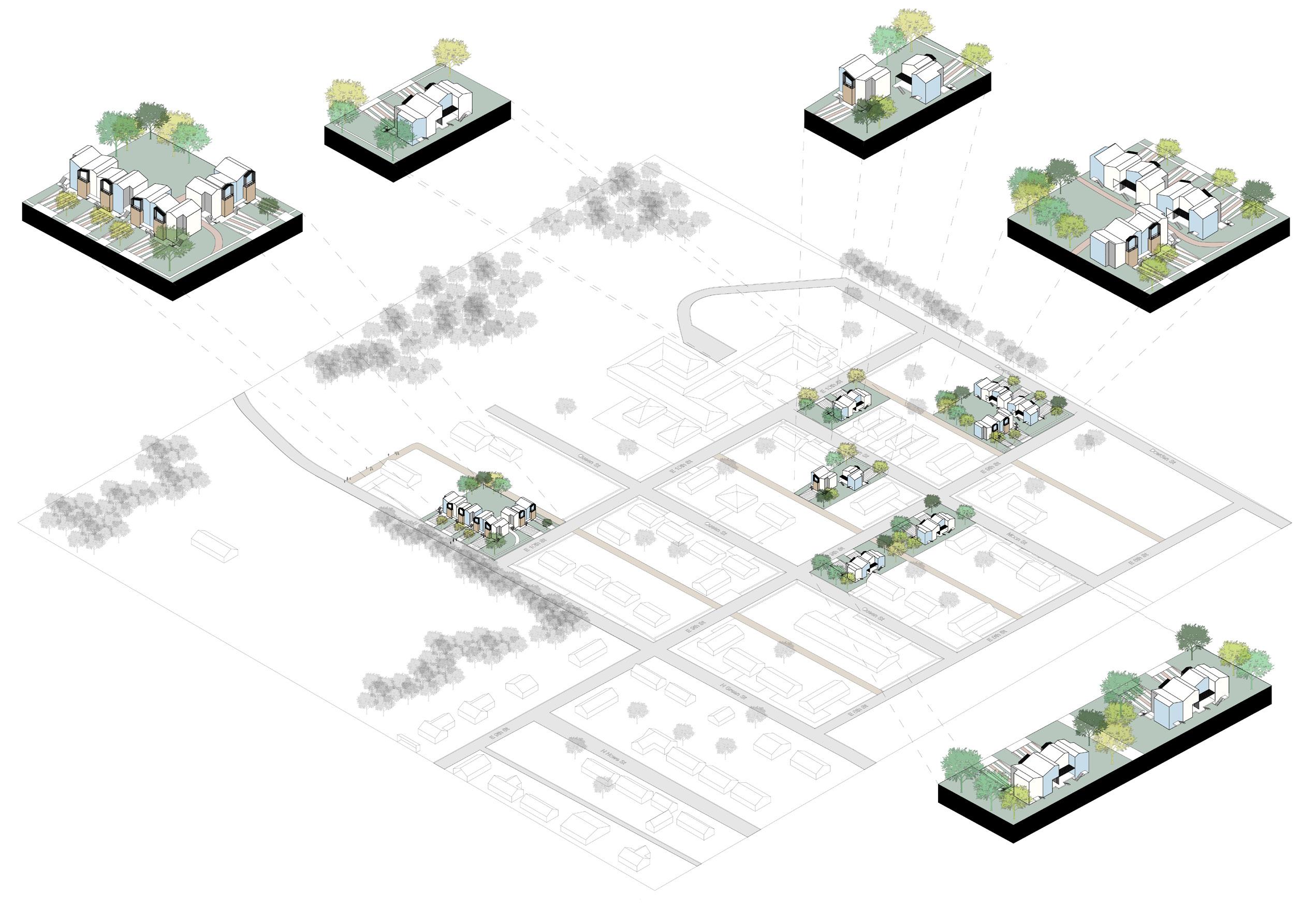 NUhouse is situated on 5 sites within Northeast Valentine. Its presence on those sites makes it a major shaping force in the context and while the design focuses on a modernization of rural cities, the affordable housing project relies on the density created within the neighborhood.