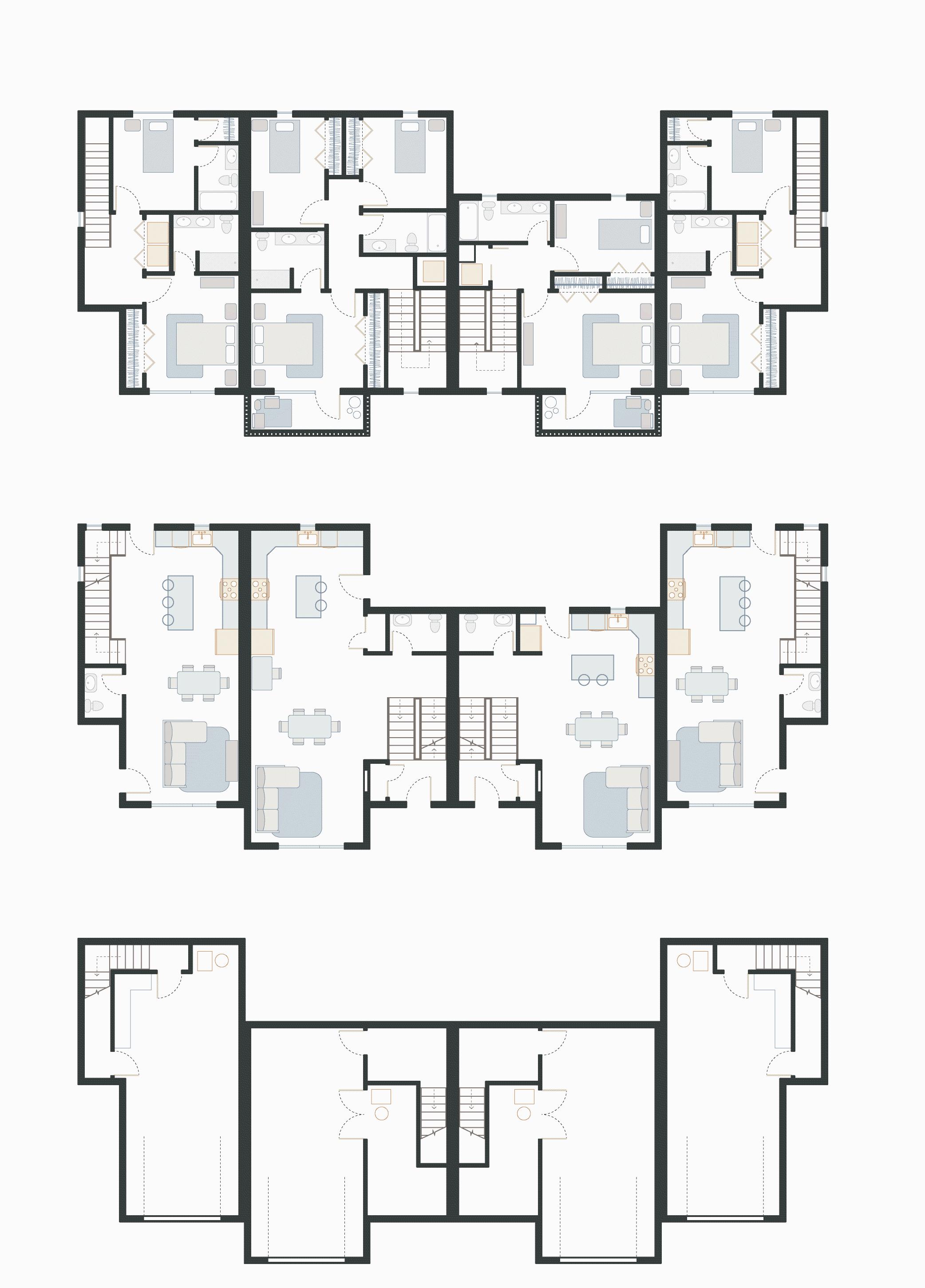By using repeating units attached to each other the design achieves a row house style with more flexibility on space uses. The three different unit layouts change the entrances making each unit have their own respective entry experience as well as distinguishable from the street.