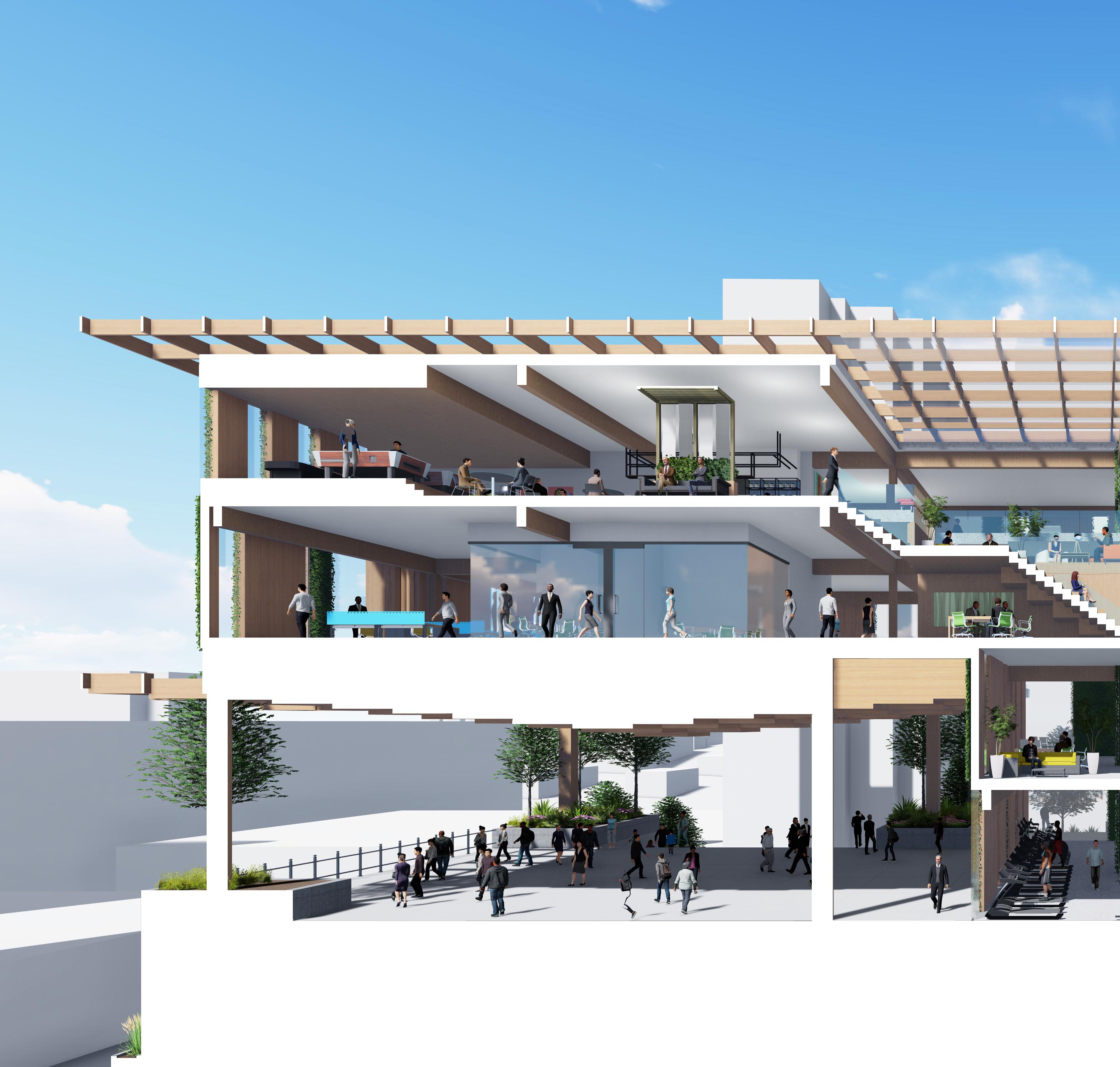 The formal progression relies on sustainable design, creation of public space, and spaces that create unique user experiences. The designs stepped patios allow for flexible work and event space while integrating into the overall master planning.