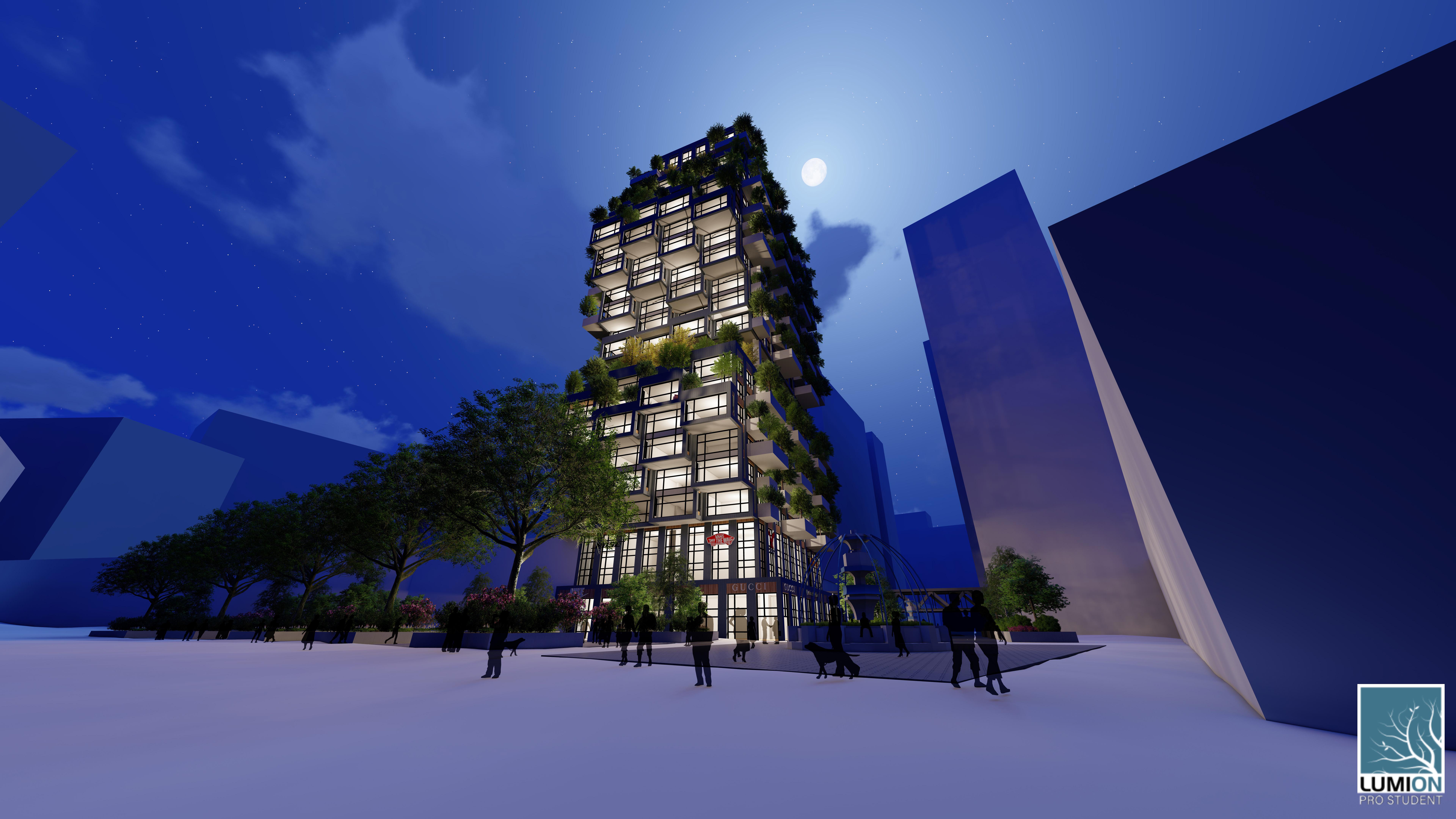 To highlight the vertical forest the materials chosen for the project highlight the conditions created by the vegetated balconies. The dark metal paneling facade blend into the shadows created by the trees and bushes to help make the vegetation determine the form of the building in the day. At night the facade is different as interior light illuminates from the mostly glass facade. Rather than blocking light, at night, the interior lights of the design back light the vegetation on the balconies and thus the true form of the building emerges.