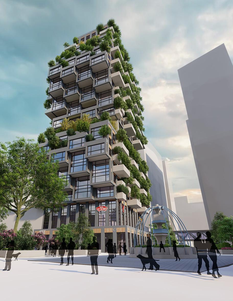 In the design Polaris Place uses green design to stick out within the context of the site. Its vertical forest on the east and west facades differentiate the mixed use housing development from the office towers and other market rate housing the in the mall district. The mass of the building was adjusted from the master plan to stick out into the thoroughfare impacting the natural flow of the space to highlight the buildings importance.