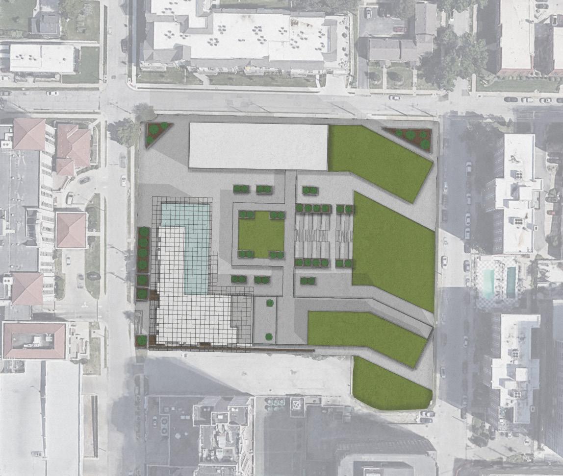 REBOUND. is in the Country Club Plaza in Kansas City. It sits on the west edge and is considerably higher in elevation than the shopping plaza. Its location makes it a prime spot for retail, hotels, and community spaces. The barriers to the site are KC’s climate, the site’s topography, and the solar shading of the surrounding buildings.