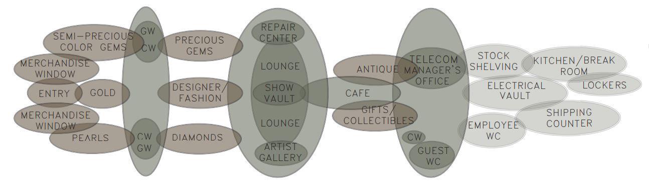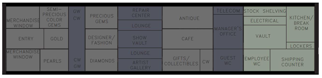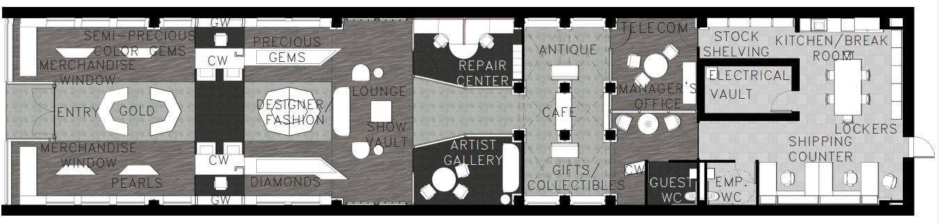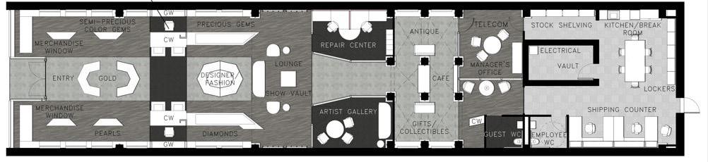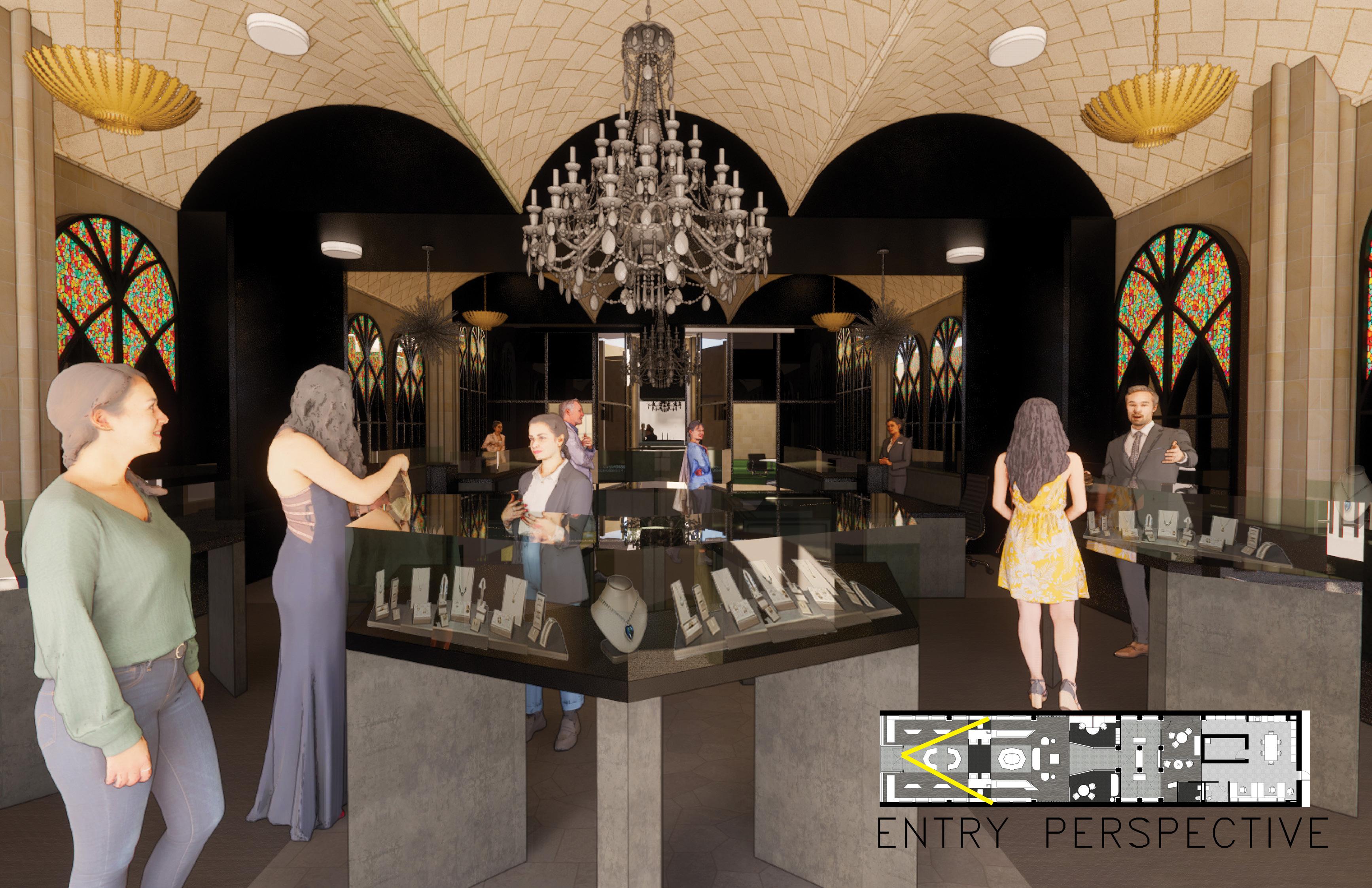 The entry door is recessed into the building creating a space for the door swings without affecting pedestrian flow on the street. The floorplan was arranged symmetrically along each wall with display islands and a show vault in the center of the space. Halfway through the space, an in-house repair center is mirrored by an Artist Gallery. This gallery was developed and informed by market research of trends in the high-end jeweler space. Research has shown customers want a unique shopping experience while still being exclusive to their shopping price-point expectations. This Artist Gallery developed for Abbey Jewelers sets up space for customers to interact with jewelery artists and vendors on a rotating basis, creating exposure to visiting artists while engaging customers with refreshed purchase options.