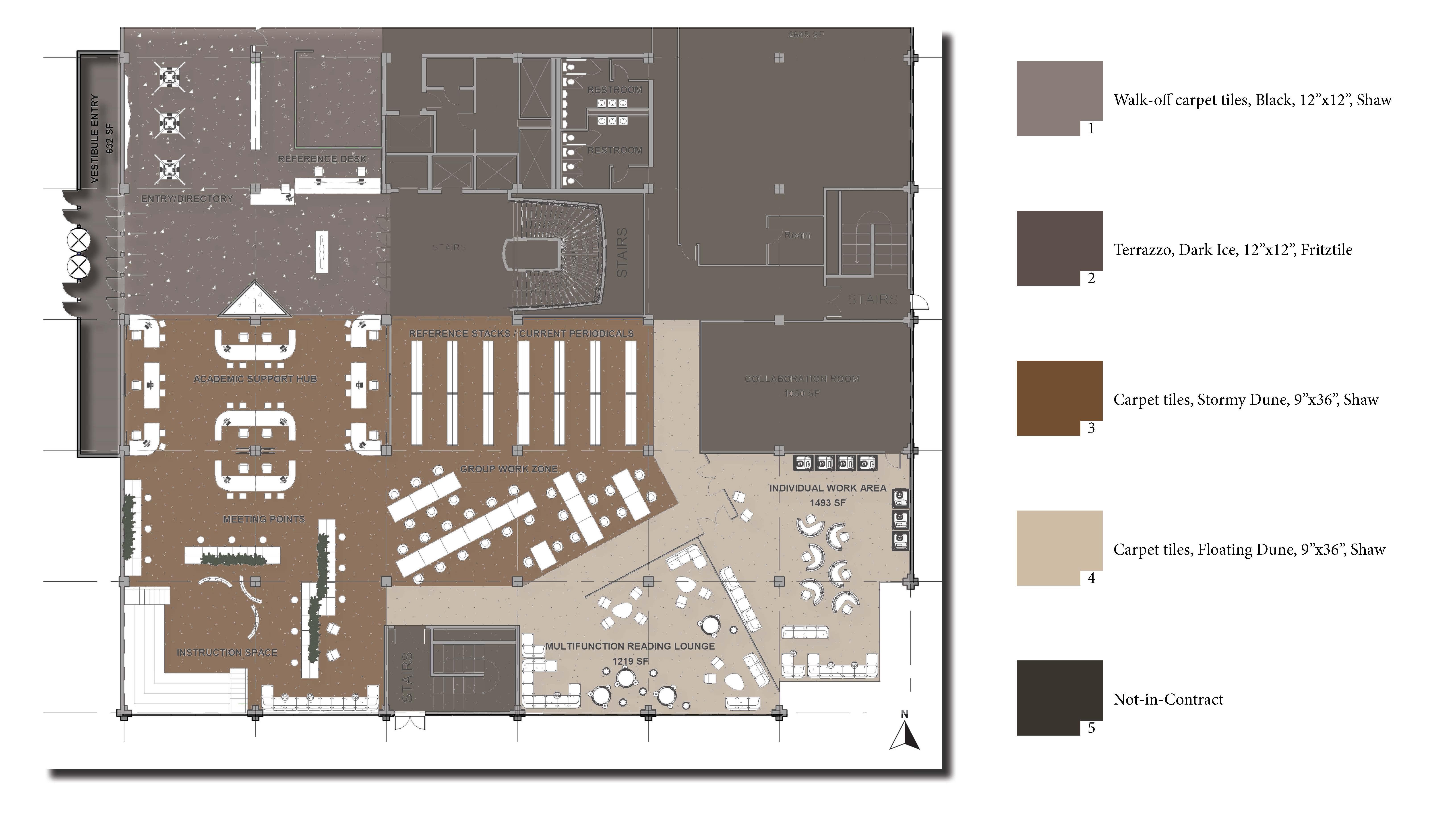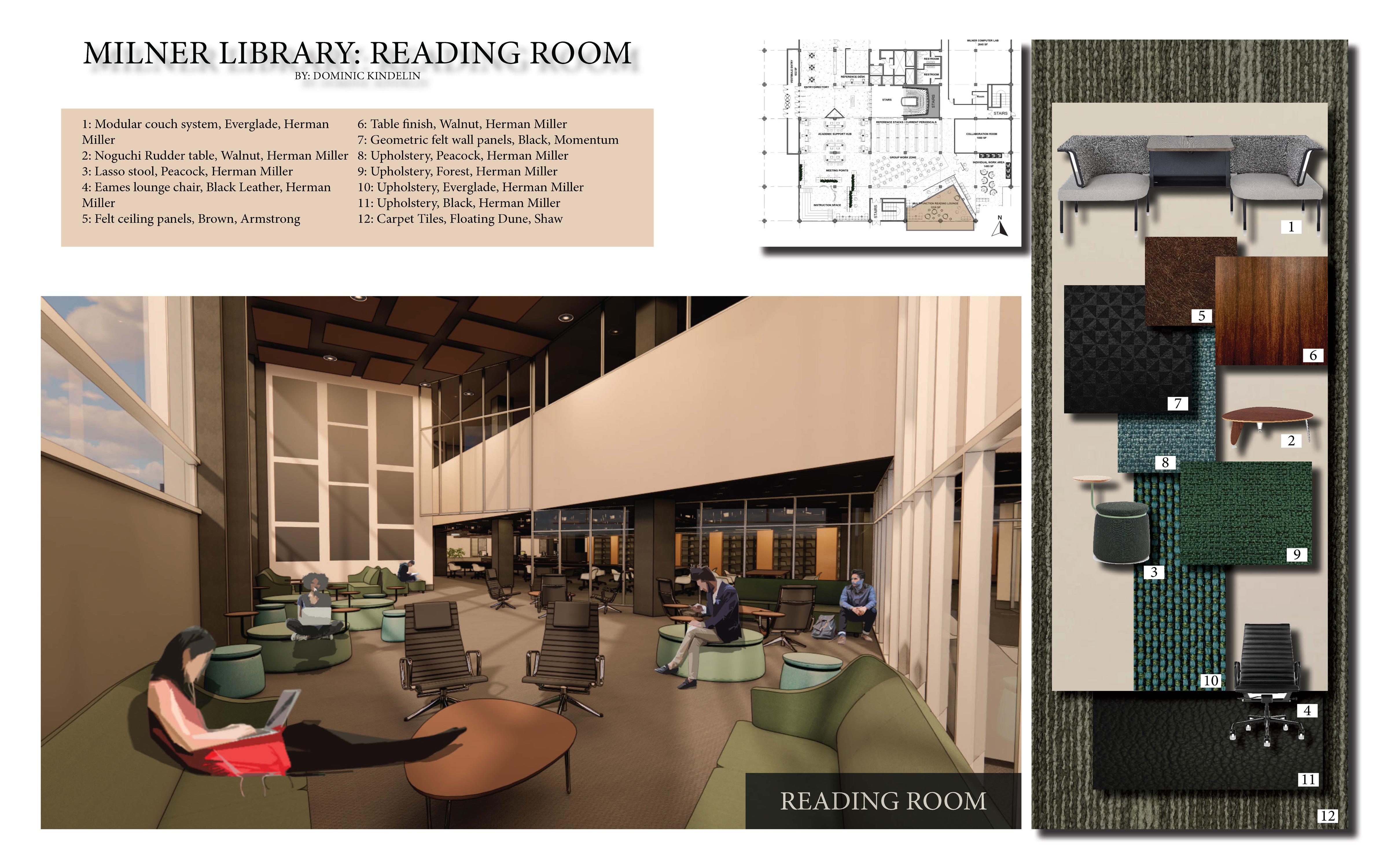This reading room was designed for students to have a space in the library to relax and take a break from studying. It is differentiated by changes in flooring and a partial glass wall which help with noise pollution from other, more social areas of the library.