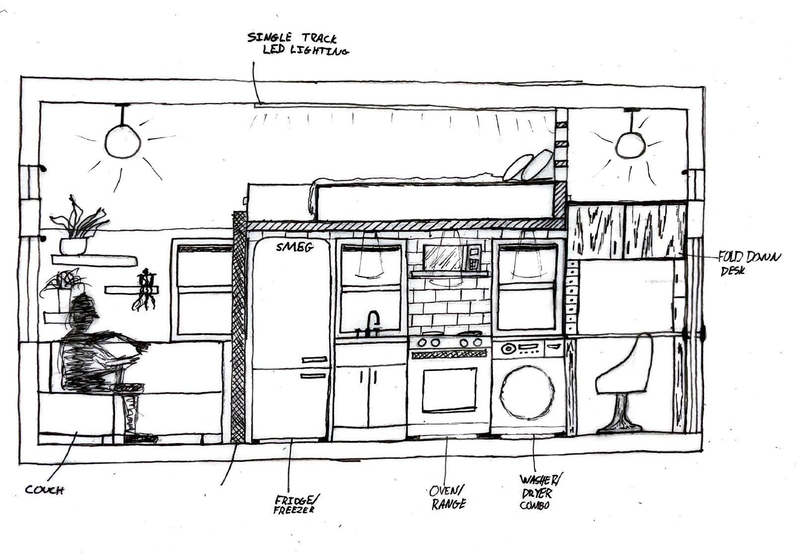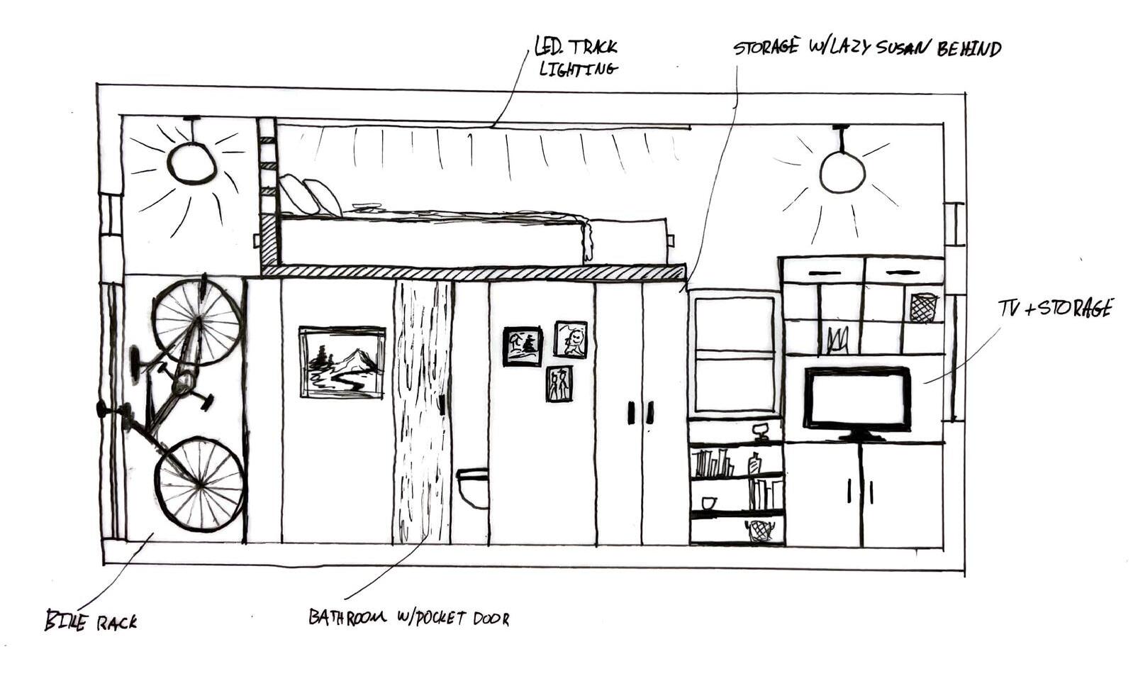 The entire project was developed by hand and drawn to scale. The space includes a kitchen, bathroom with shower, a living area with couch, a lofted queen bed, and a work desking system which can be folded up and away when not in use. The space also includes storage throughout and space for the client’s bike.