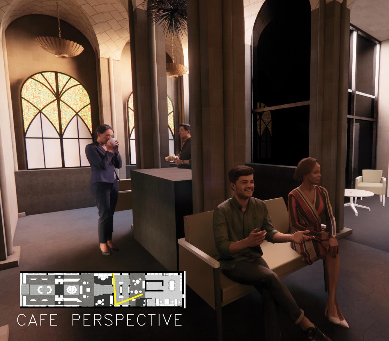 A mixed use cafe is located at the rear of the retail space. The serving counter is placed in the center of the space for optimal circulation. The architecture is distinctly classical with supporting Gothic columns, arches, and intersecting barrel ceilings.