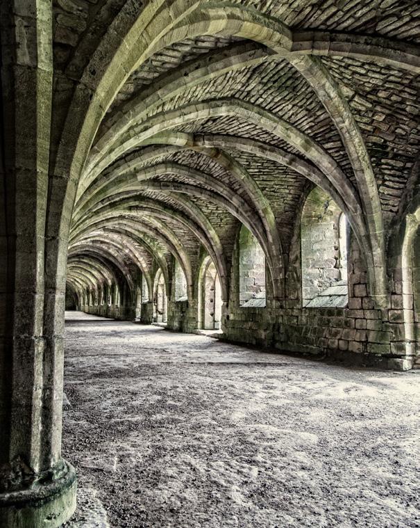 Greeting shoppers when they arrive is a grand foyer with classical barrel vaulted ceilings and decedent lighting and chandeliers. Display cases are starkly modern with cement legs and black stainless steel surfaces. Symmetrical back-lit stained glass mirrored windows repeat at intervals on either wall contributing to the brand’s Abbey namesake.