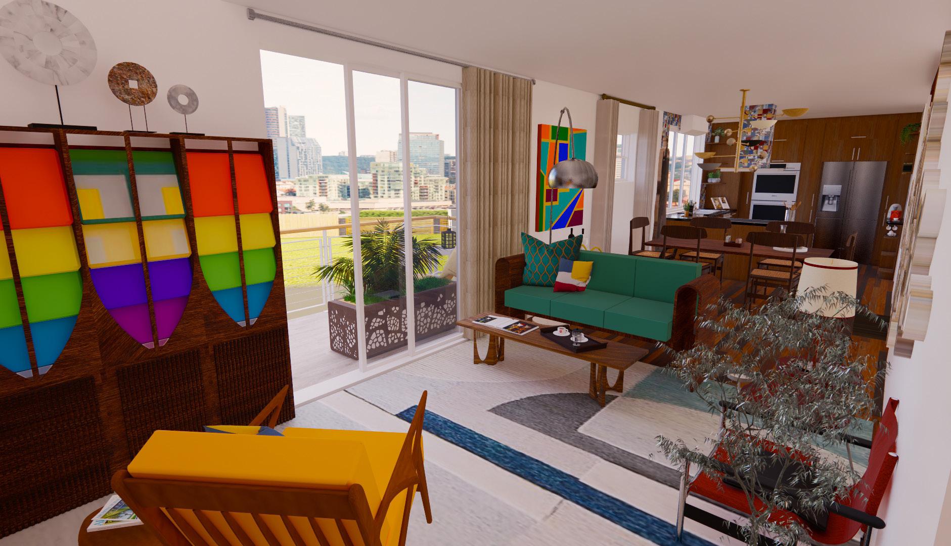 The living room is styled after Brazilian Mid-century Modern design. LIVING ROOM: