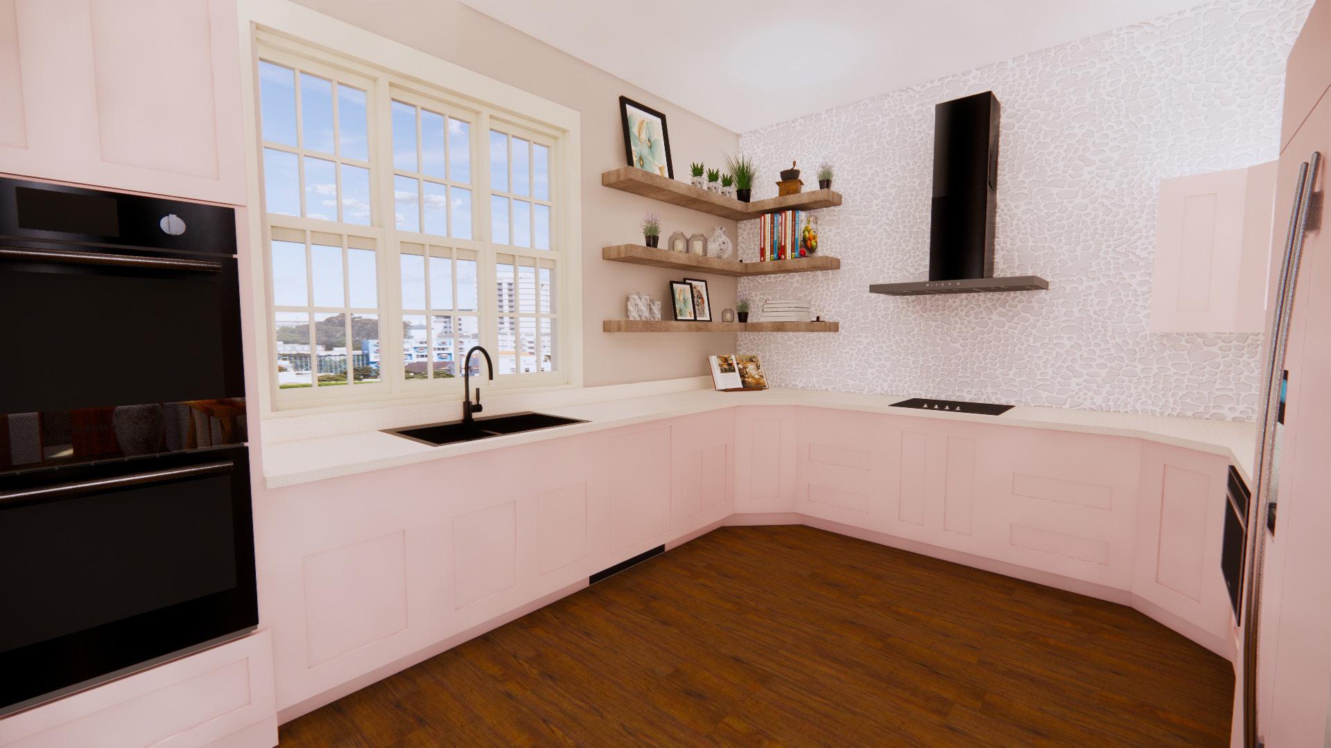 The kitchen was listed as a priority for both clients. They like to cook and bake as well as entertain. They also specified large windows to allow natural light and pink cabinets. The resulting design meets their specifications with a large u-shaped space which allows for several people to use the kitchen at one time.