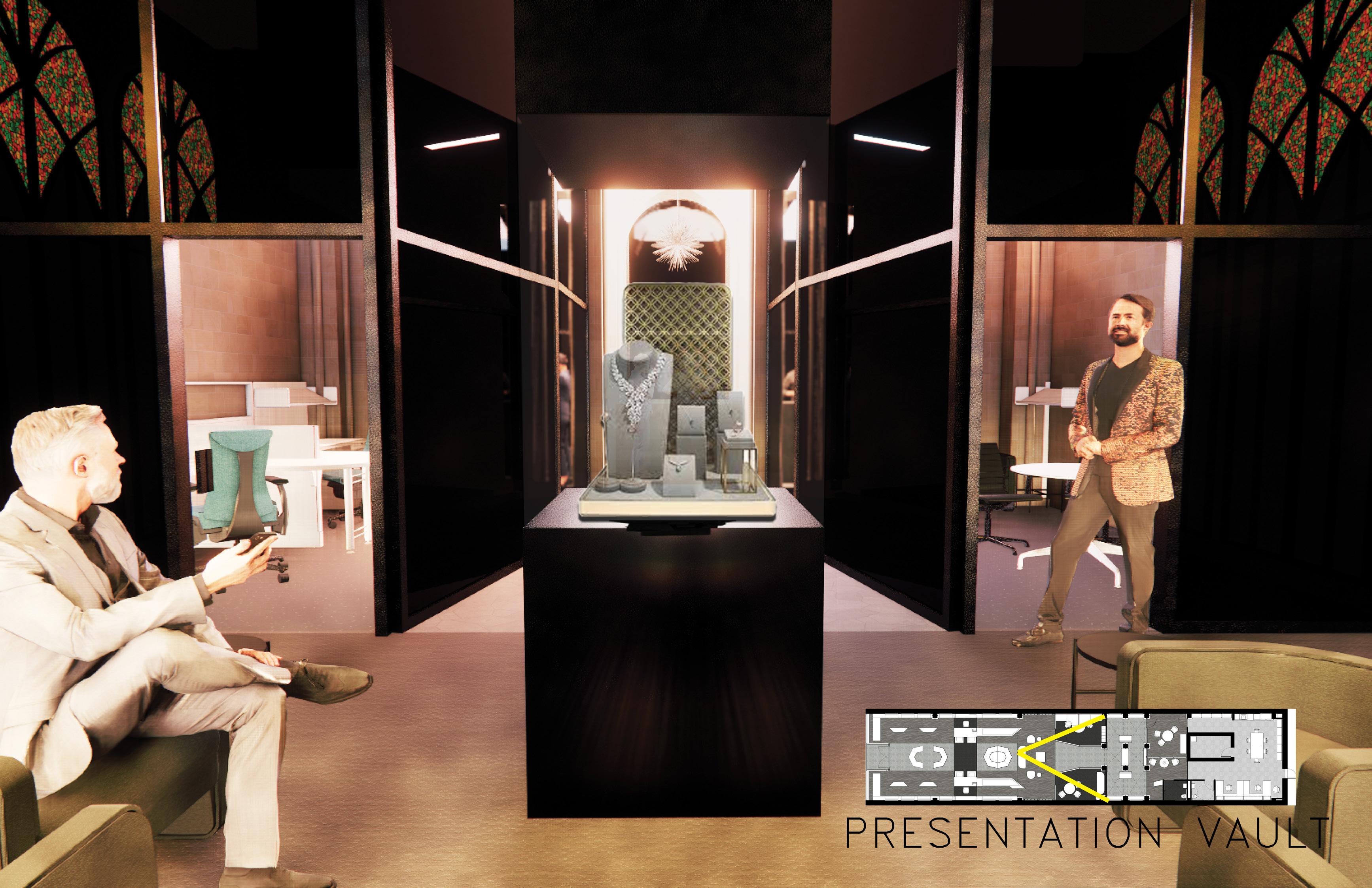 Midway to the rear of the store is the presentation vault. This vault was imagined as a way to present a shopper with their purchase upon delivery of the item or to display show stopping pieces to entice shoppers. Items being repaired at the in-house design center could also utilize the presentation vault for client delivery upon rework of their piece.