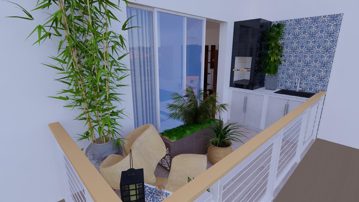 The balcony includes a sitting area and a custom mini-kitchen which houses a churrascaria and sink for prepping Brazilian barbecue.