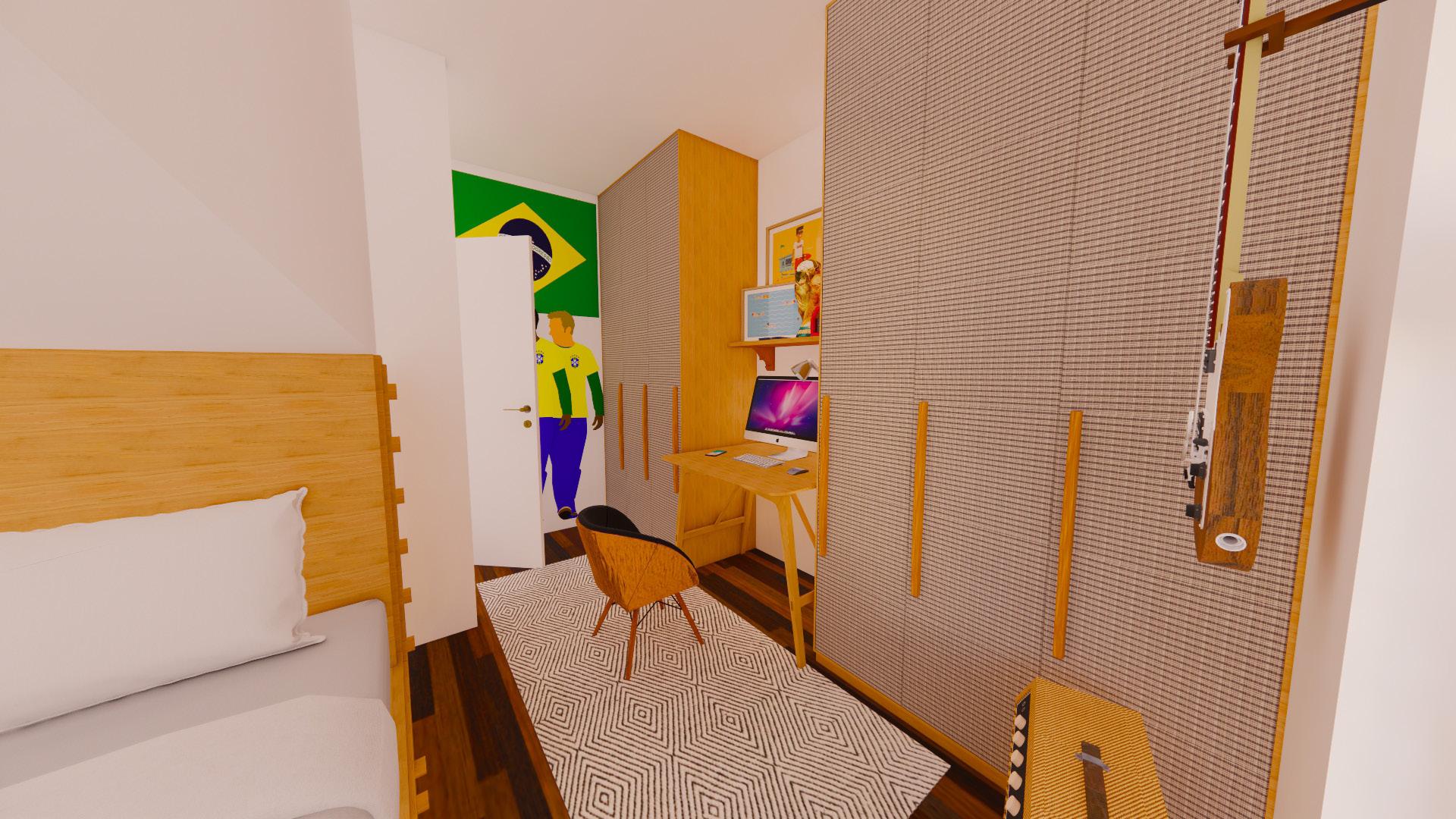 Special attention was paid to the two bedrooms for the children. Mateus, the older child plays the guitar and spends time on his computer playing videogames. Julia, the younger child enjoys crafting, playing with LEGO, and having friends over. With the limited space in the apartment, a unique bed-bunking system was designed so as to keep each bedroom separate while also using the vertical advantages of such a system.