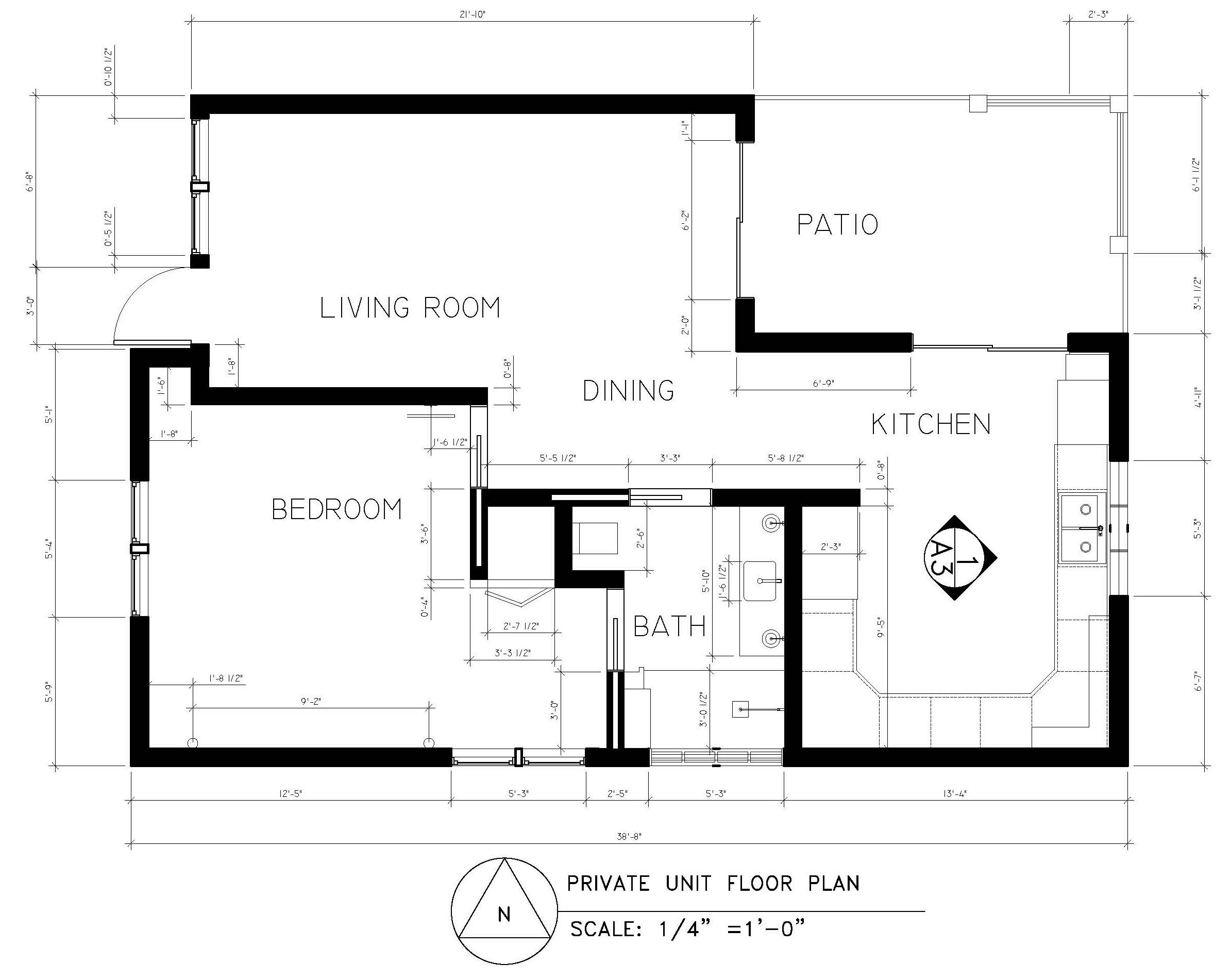 Figure 1 shows the floorplan of the home and the spacing considerations for circulation and freedom of movement for the client. Figure 2 shows the plan for circulation with the addition of furnishings. The clients specified they needed a large space for baking and cooking so the kitchen was designed for optimal movement. Figure 3 shows the eastern elevation (A3) of the kitchen with dimensioning of cabinetry.