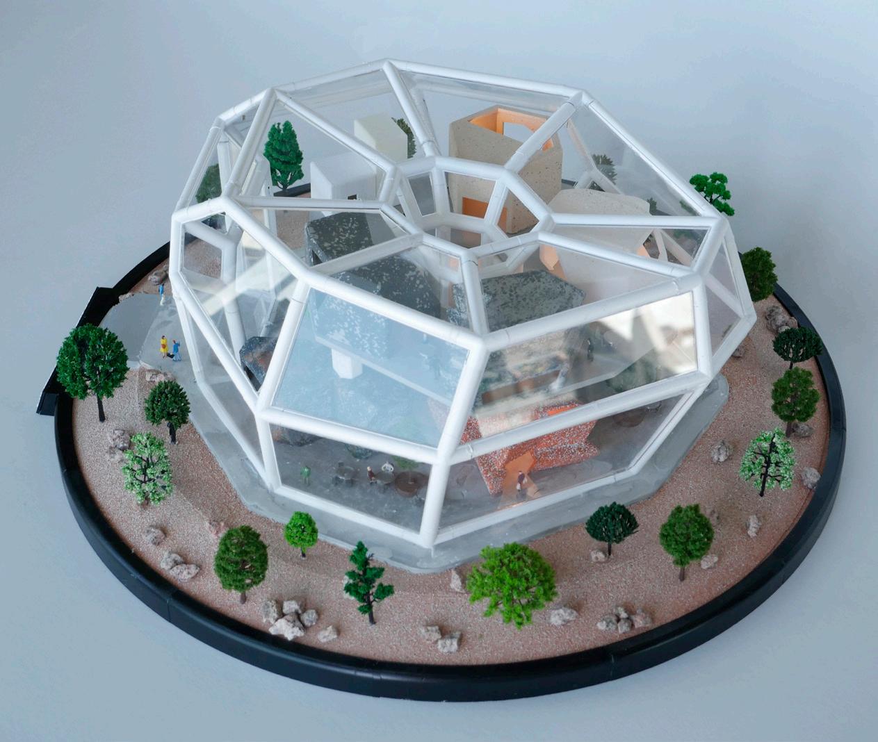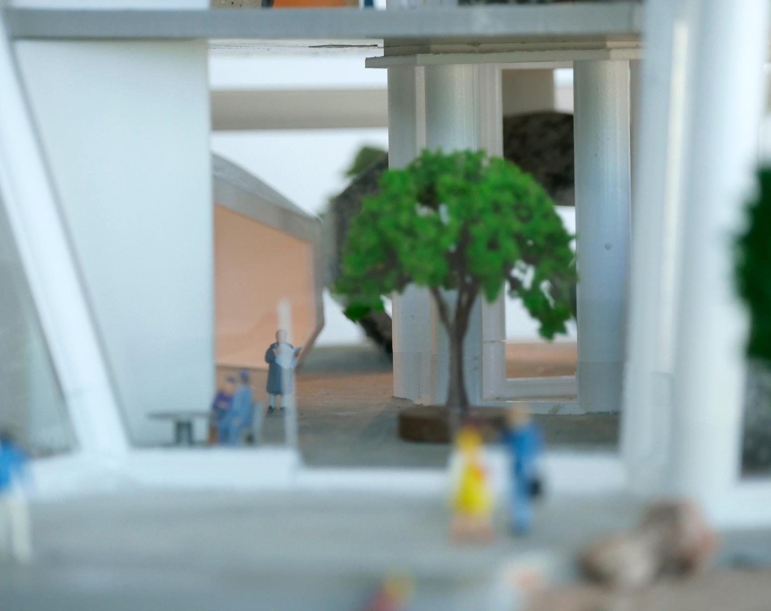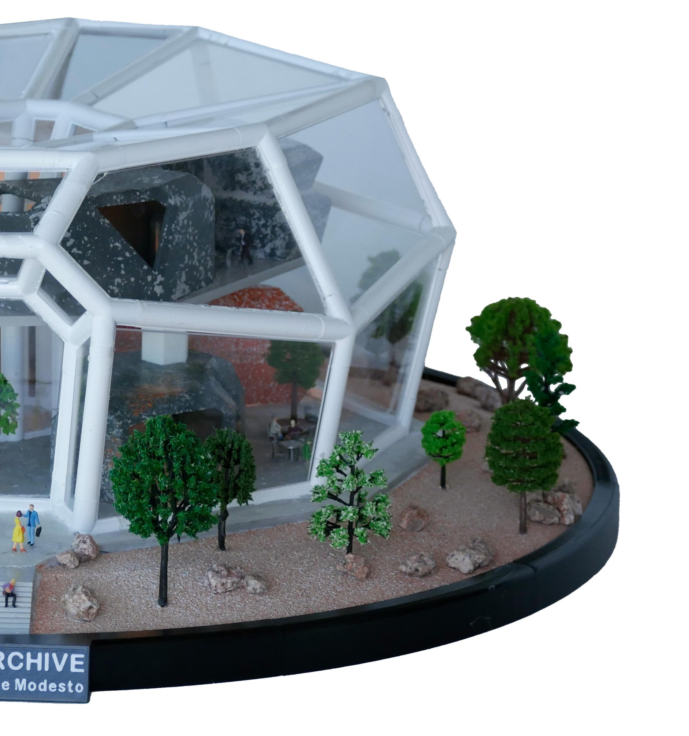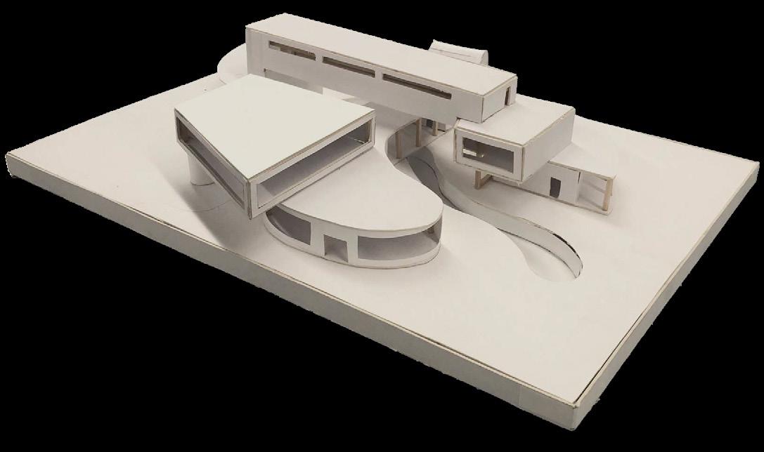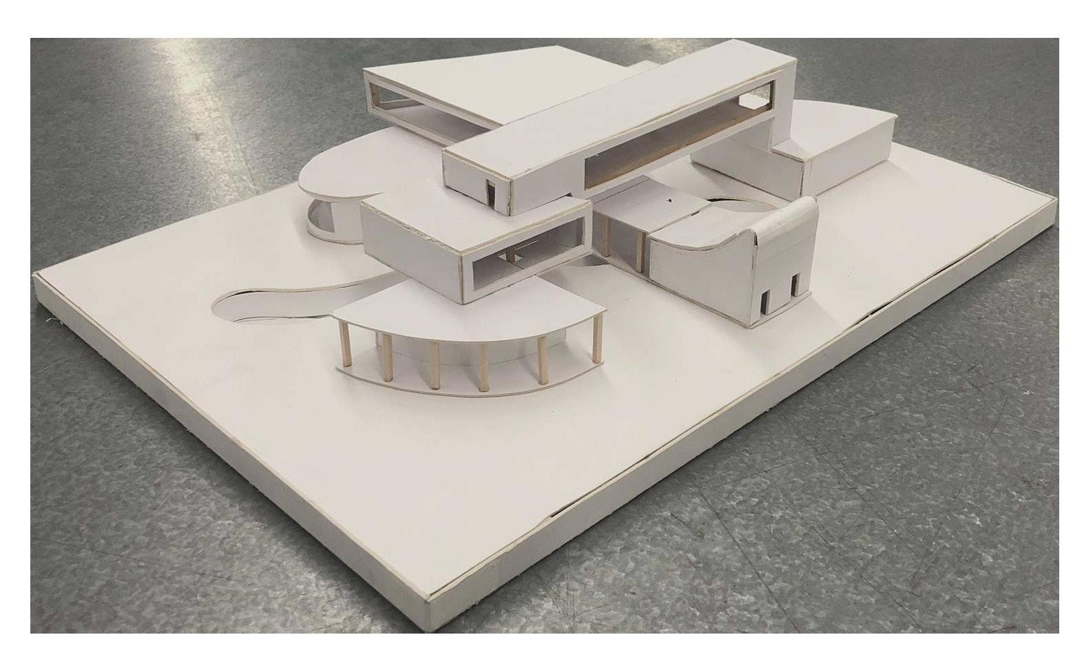 A preliminary, 1/16 inch scale model was made to investigate massing, circulation, and form. The final model makes extensive use of 3D printing, CNC milling, and laser cutting. The interior lights are powered via wires running through conduits in the concrete foundation that connect each room.