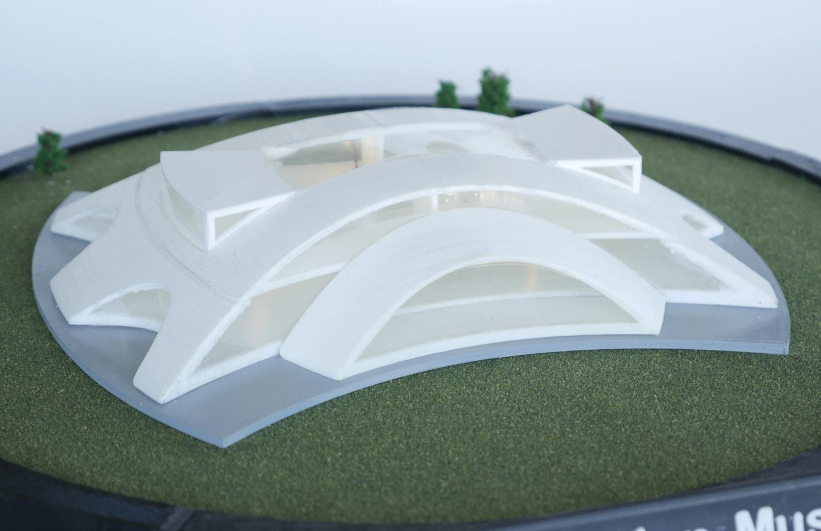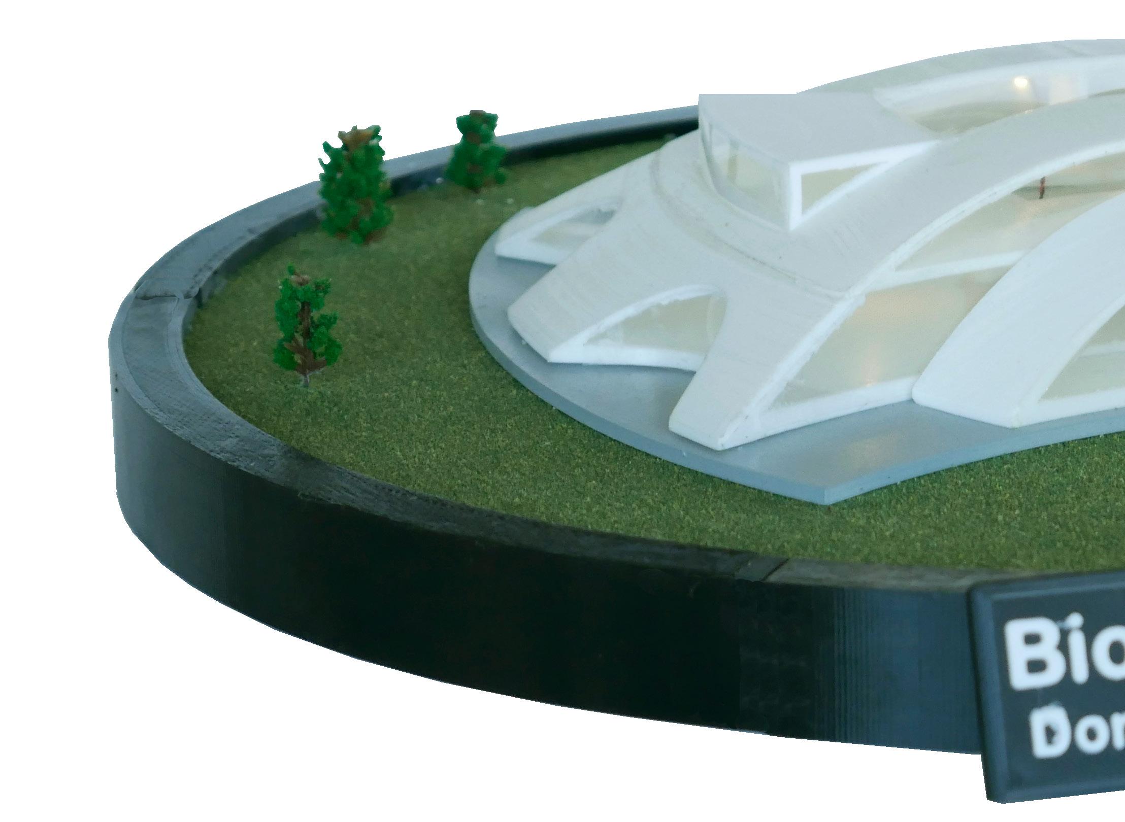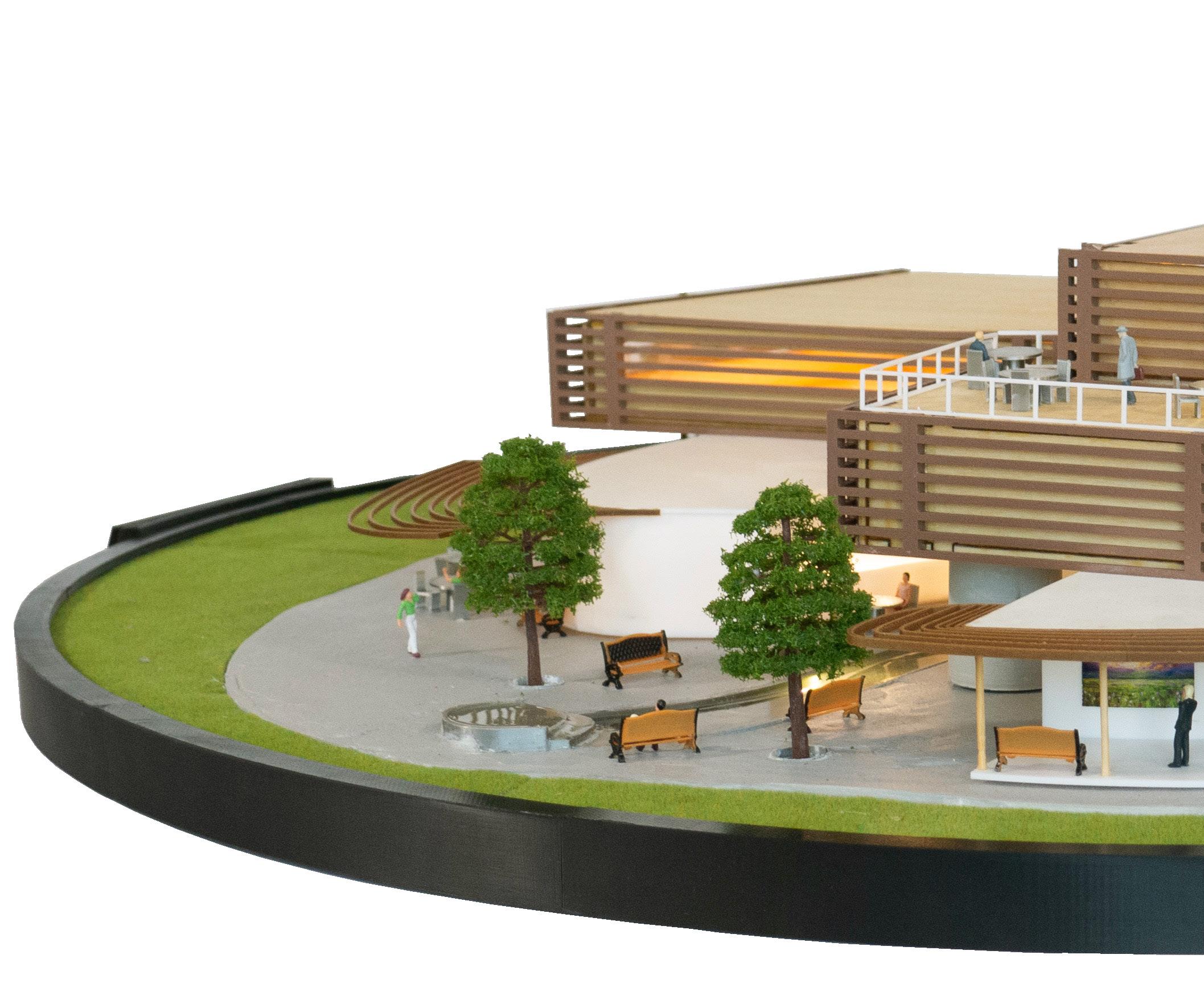 The final model emulates how the building would be constructued in real life. The model structure is built with a wooden dowel frame, encased in a 3D-printed façade. The wooden base has an area carved out for the structural footings, lighting conduits, concrete foundation.