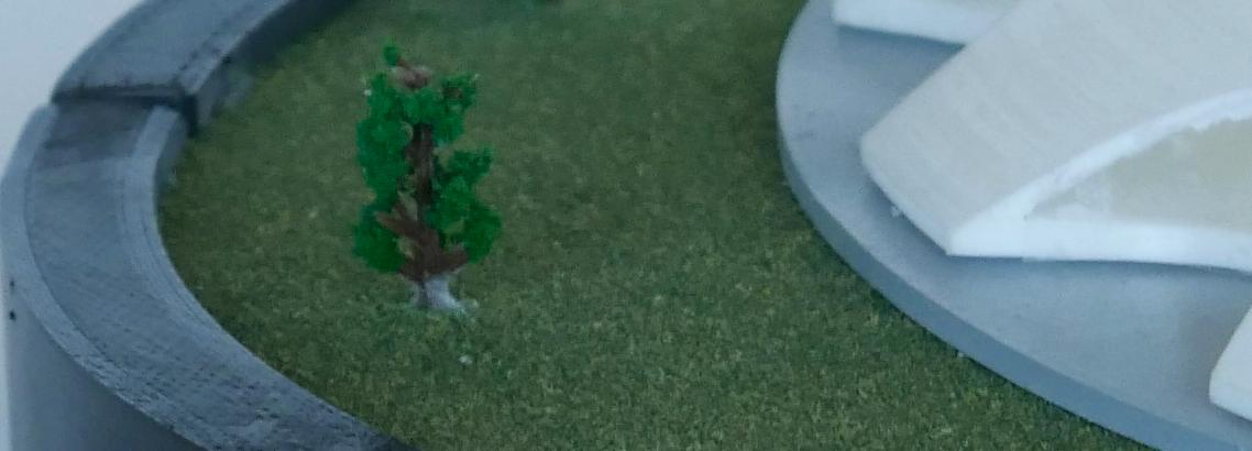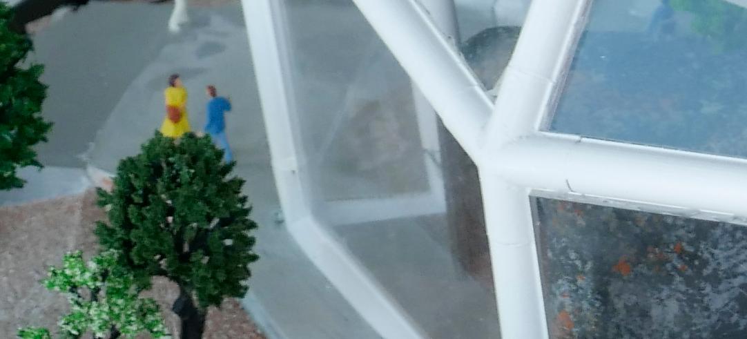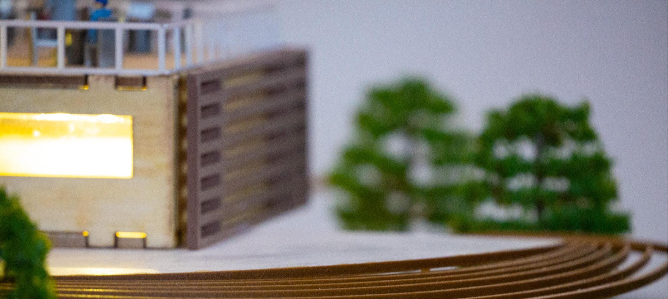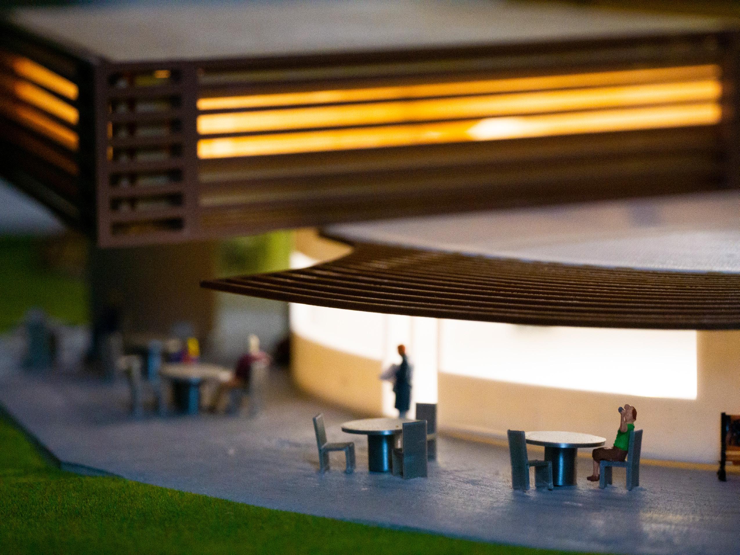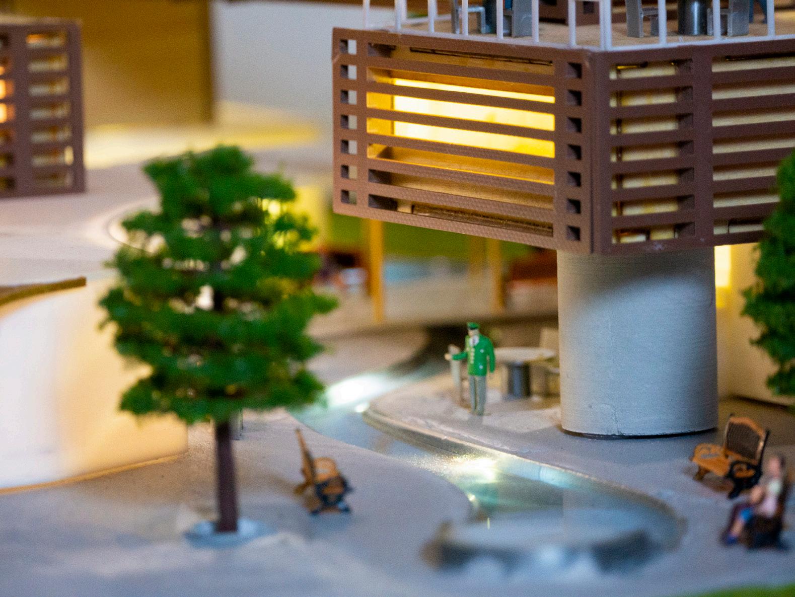 The final model emulates how the building would be constructued in real life. The model structure is built with a wooden dowel frame, encased in a 3D-printed façade. The wooden base has an area carved out for the structural footings, lighting conduits, concrete foundation.