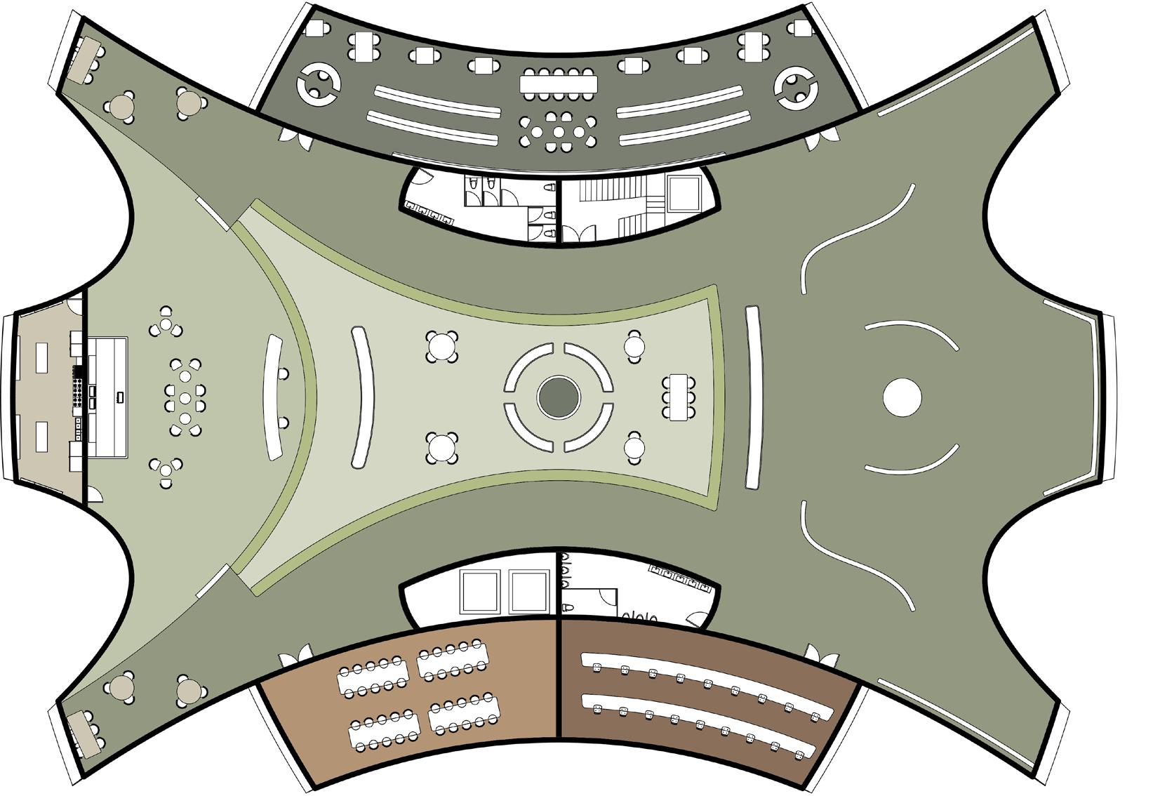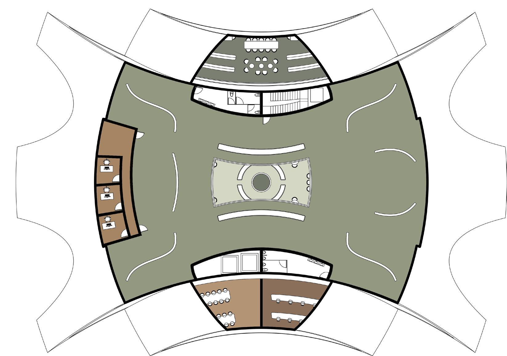 The second floor features office and exhibition gallery space. Seven curved interior walls offer places to hang paintings or have displays, but also serve to guide patrons about the floor. Section A