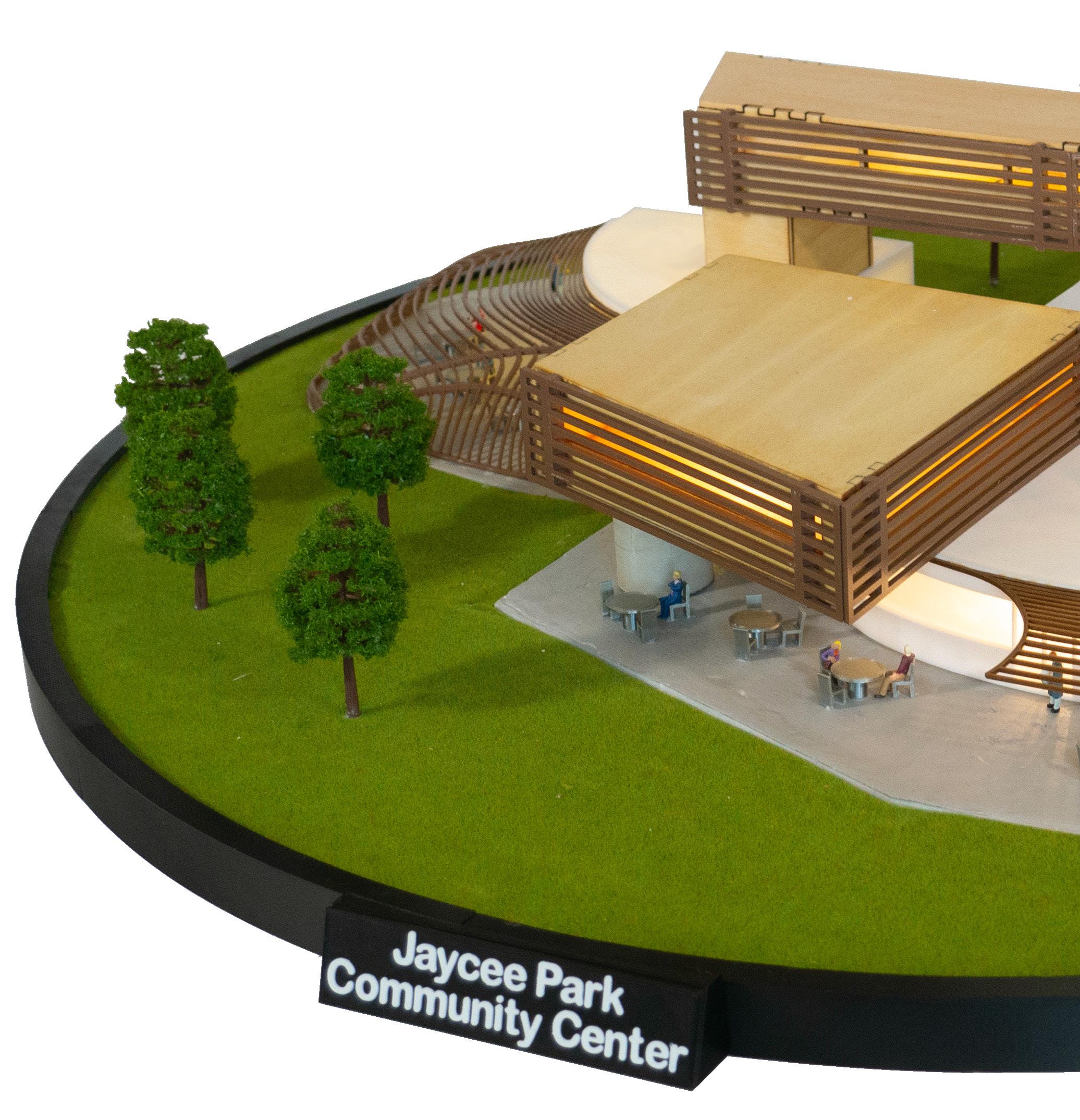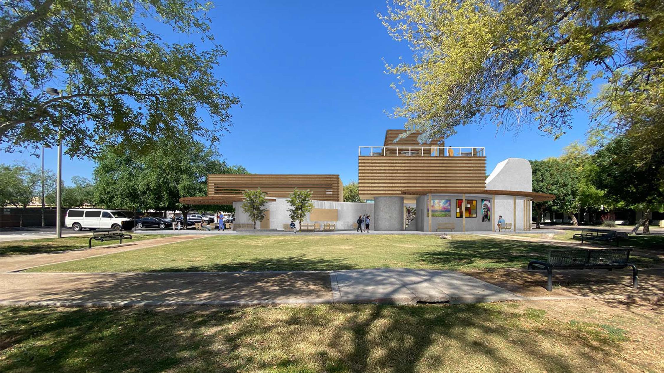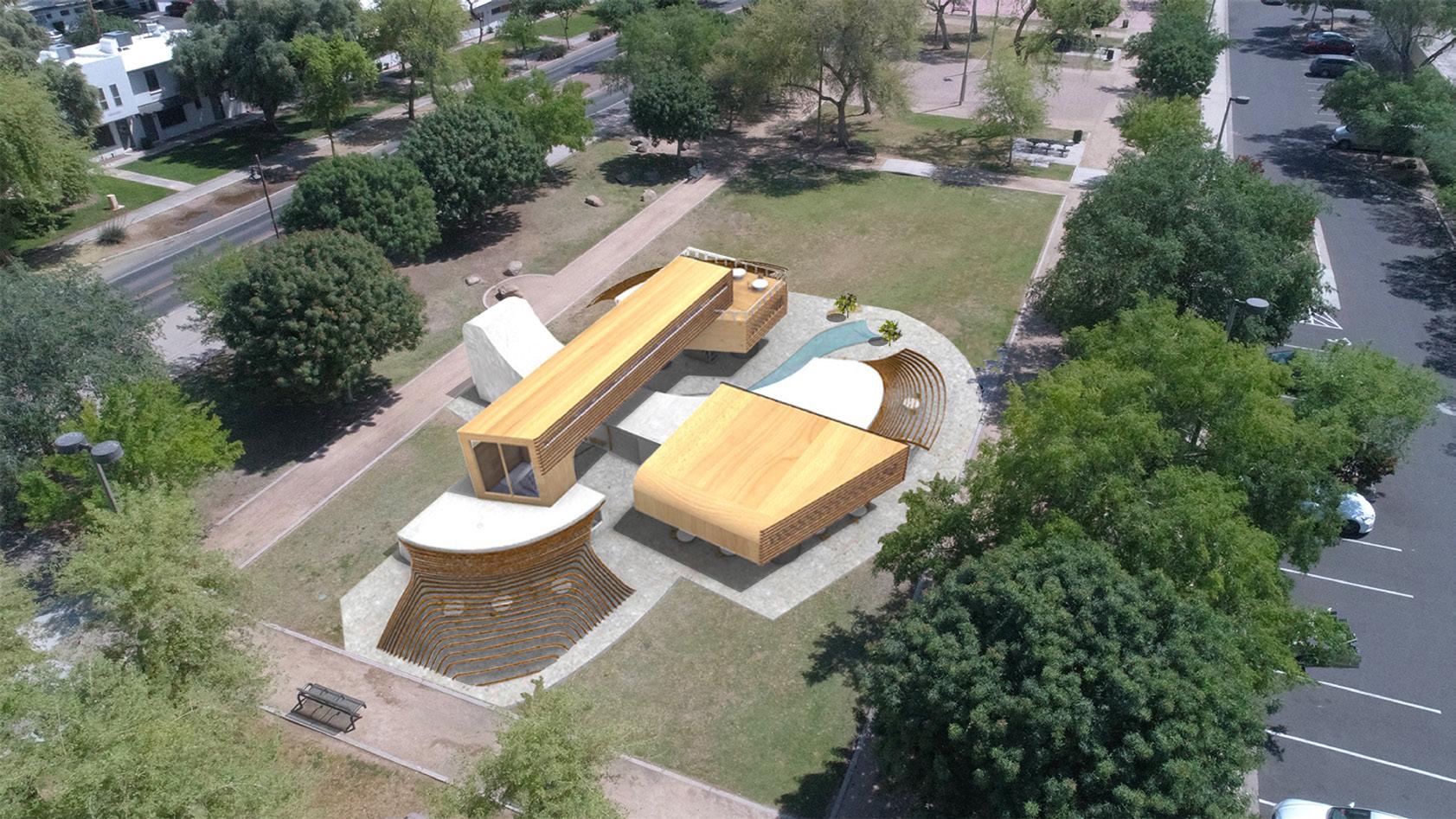 Sited in Tempe, Arizona, the Jaycee Park Community Center is designed to the community voiced issues of heat, homelessness, and lack of seating. This project is a collaborative design by Dominic Lowell and Jack Carleson.