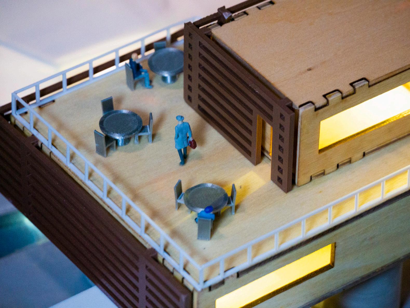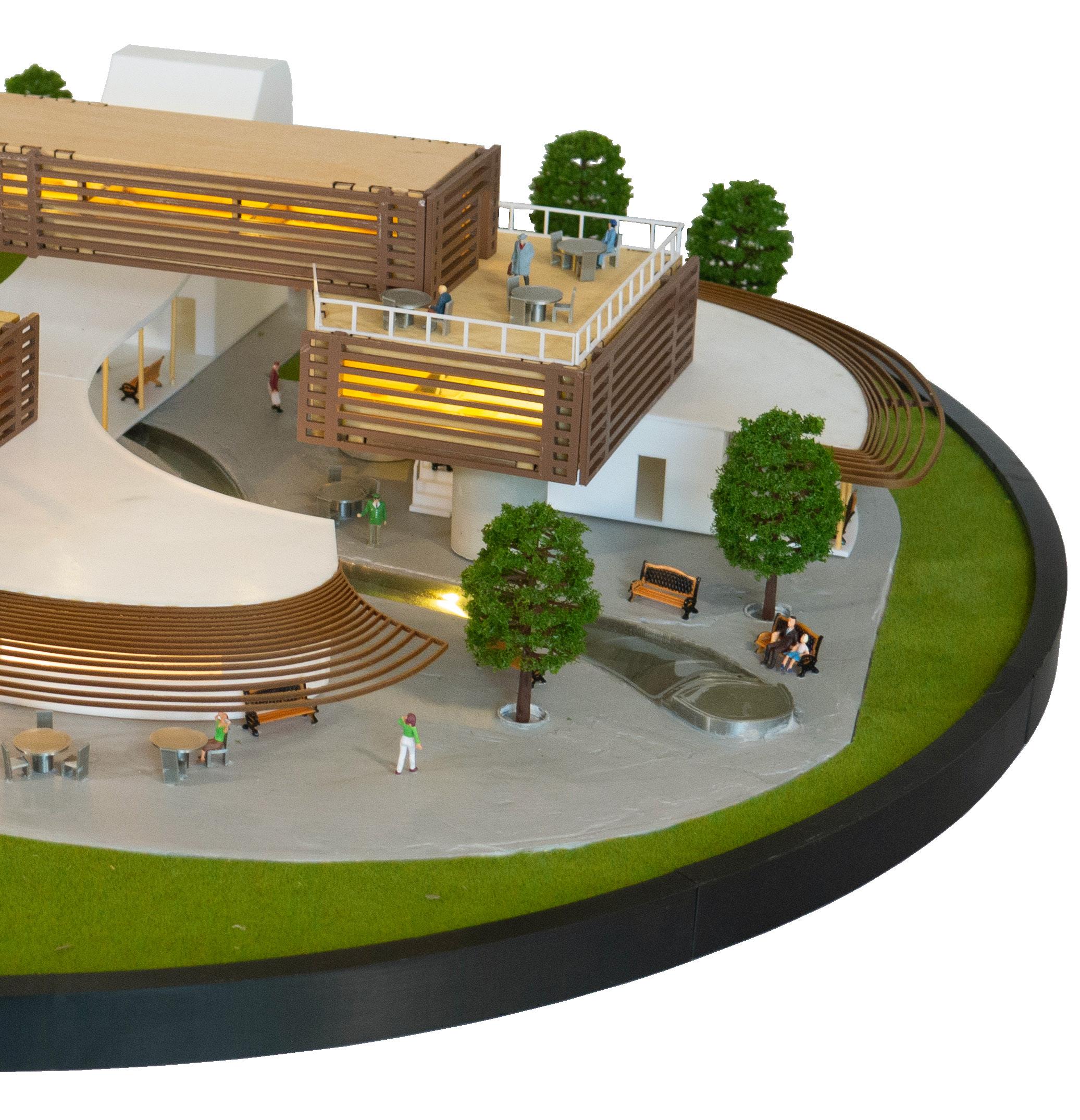 The final model and renders convey how the project answers the issues voiced by the community. Plenty of outdoor seating exists under cantileverd rooms and around the peaceful river fountain.