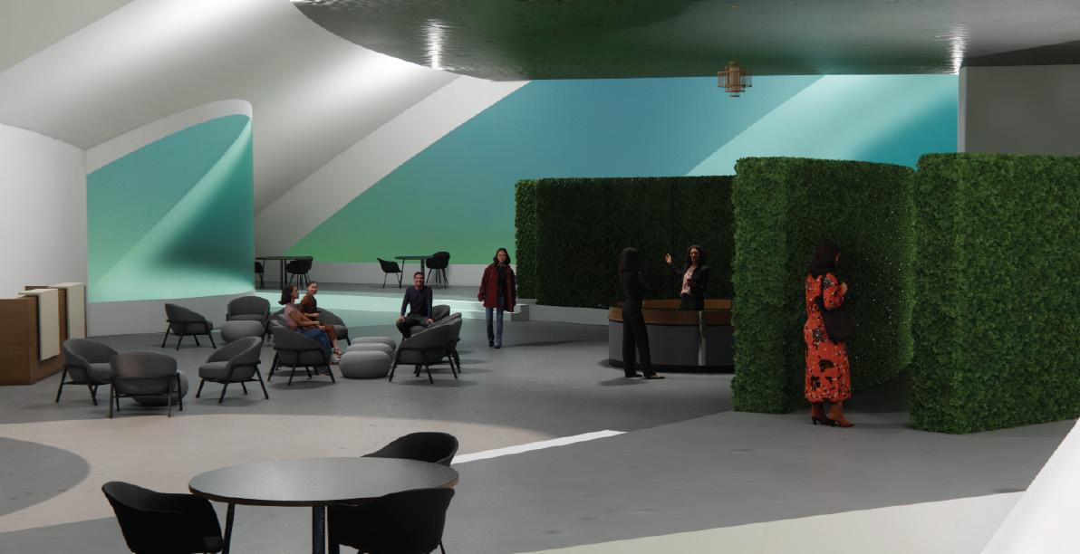 The first floor of the BioIntegration Museum features exhibit galleries, a classroom, research lab, central atrium/ greenhouse, café, and library. Plant walls surround the central atrium to provide a secluded space for contemplation or relfection.